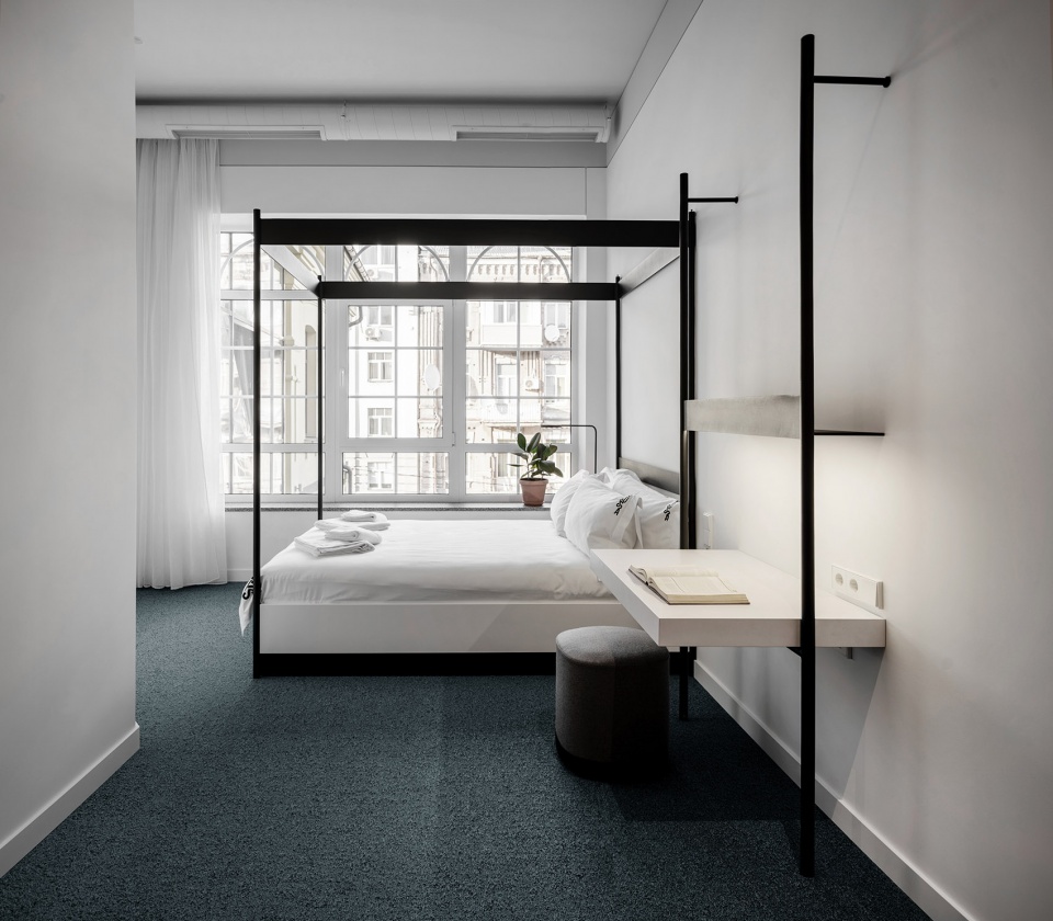 “Natural’ and ‘original’, in addition to ‘functional’ and ‘minimal’ is another way to describe BURSA style. We created a place where ‘concrete stuff is made of concrete, and wooden things – of wood, just the way it should be’. From the façade incorporating two-hundred year old buildings and modern metal structure, to the reception desk, featuring scrunched up metal sheets behind glass panel, to rooms with concise and precise objects placement, – the hotel complex appeals to those who appreciate comfortable simplicity of modern design. We hope we created a place where one comes as a guest and feels at home.
