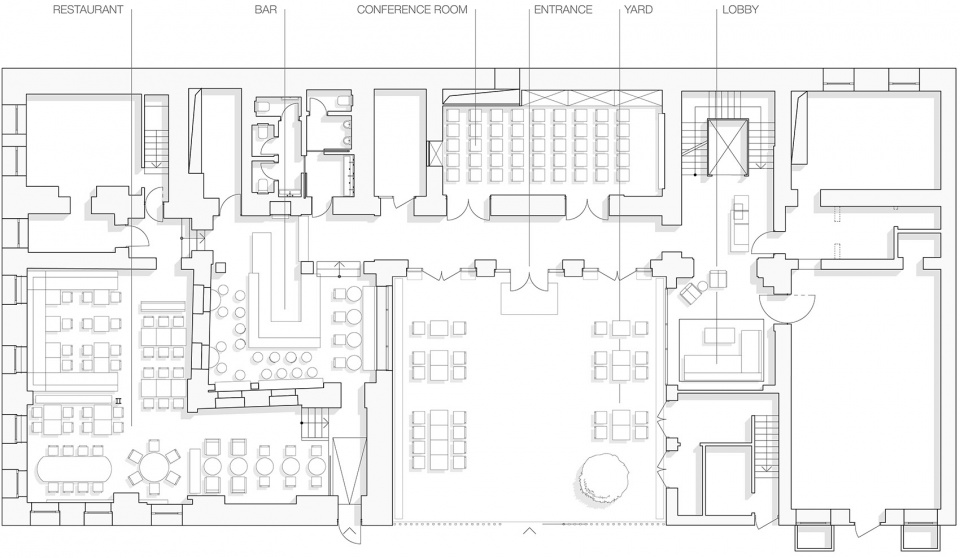 We believe that for any design element to look authentic and original, it simply has to be just that. With such approach, we spend a lot of time searching for the right materials, furnishings and shapes. To make a brick frieze supporting the bar in the Belyi Shum Cafe, for example, we found bricks made in the same year as the building. We wanted the frieze to be perceived as an integral part of the wall, rather than a later addition forced into the interior. The restaurant chairs, another example, are deliberately ‘old school’ and all original, found in Parisian and Norwegian antique shops and flea markets, then restored. They add character, and emphasize authenticity and originality of the place.
