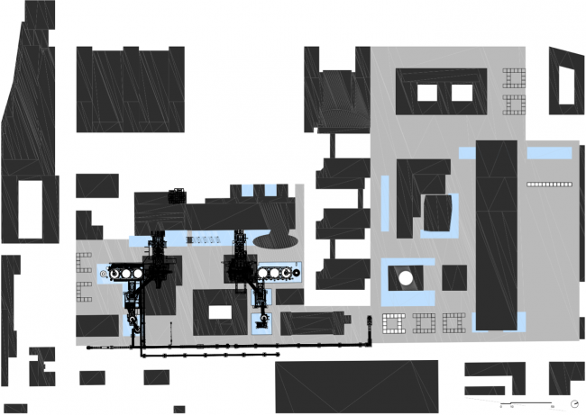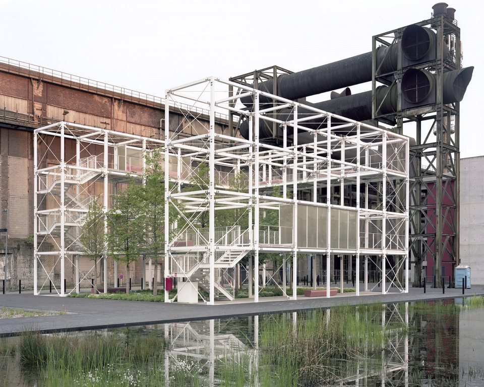 The IHA office, seeking to echo this unique and complex location, decided to create places of heightened intensity encouraging more active involvement with the site and providing a wider variety of visual and physical experiences. The site is approached three-dimensionally in response to the monumental scale of the industrial buildings of the former smelter, the density of the campus and the requirements of the program. The powerful relations and locations of these public belvedere-supporting aedicules concentrate and distribute campus activities and flows. They also provide public spaces made available up above, their height corresponding to the concrete platforms of the blast furnaces, raised to 12m.