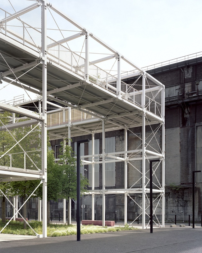 这种特别的空间设置能够使参观者快速地了解整个基地的环境,并从不同的角度来观察这些工业时代的巨大建筑物。实际上,这些垂直的结构不仅创造了避无可避的公共空间,还在其内部空间中将所有人和环境联系在了一起。但同时,它们又将身处其中的人们与这个工业场地短暂地隔离开来,使参观者们得以机会能够重新感受和领悟这个经历了空间功能翻新和再激活的巨大的工业区。