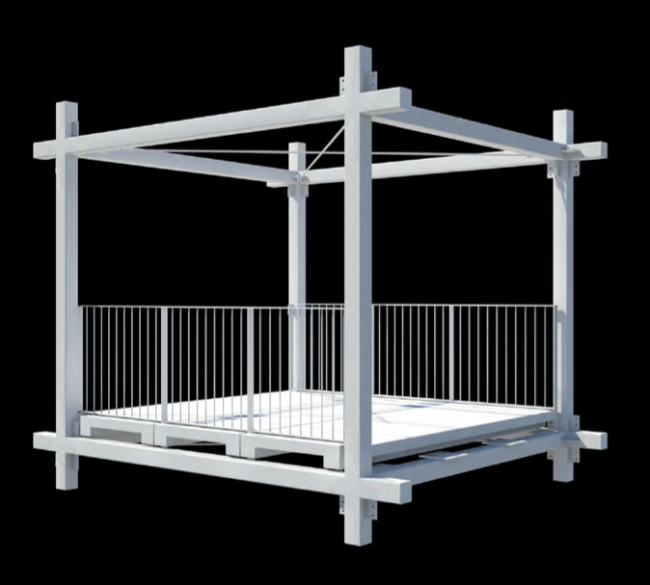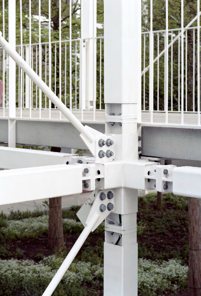 方形截面的白色涂漆杆构成3.60m x 3.60 m x 3m的模块,这些模块最终组成了本结构的金属框架。这种被广泛使用框架在本项目中创造出一种独特性,也创造出一种人体尺度与可居住空间尺度之间的双重关系。