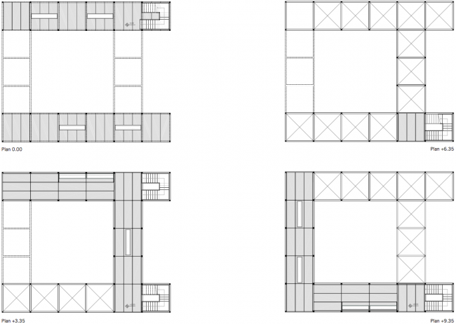 作为观景台的建筑结构被放置在基地的三侧。每个结构都有自己独一无二的外观类型和功能,从而相互协作,共同完善尚未完成的校区的总体规划构想。这些观景台结构的摆放位置和开放性构成了项目的入口,同时鼓励着人们在基地上往来穿梭。虽然这些结构被刻意放置在相去甚远的位置,但它们仍然彼此联系。这些结构有的沿着穿过基地的轴线的延长线放置,有的位于建筑的附近,不仅可以从园区的外围进入,园区里面的人也可以轻易到达。这种双入口的设计得益于这些观景台结构的进深和其上部空间的通透性,从而赋予空间一种运动性和移动性,此外,这些设计还为使用者创造了一些大学校园中难得的沟通交流的空间条件。