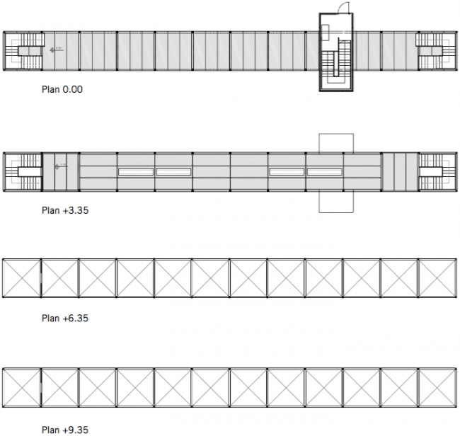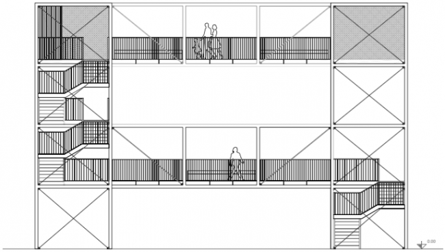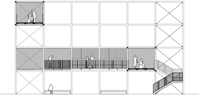 Belvederes, footbridges, arcades, stairs and alcoves offer a broad range of situations for experiencing the interiors of these structures. Exposed to the climate, lengthwise they create empty, semi-open mezzanine spaces of diverse qualities and uses. There are a number of areas for sitting, equipped with benches with backs, which enable visitors to really inhabit these places, relaxing out in the open, gathering and sharing, while still being protected.
