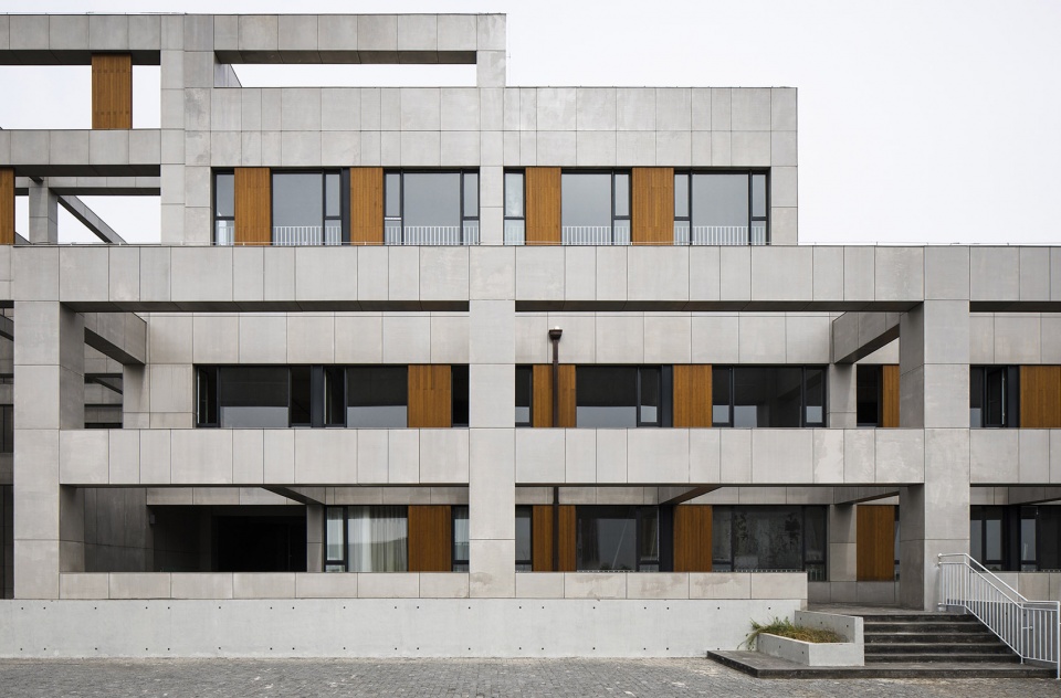 Main materials: Fair-faced concrete, black travertine, wood cement board, laminated bamboo panel, terrazzo