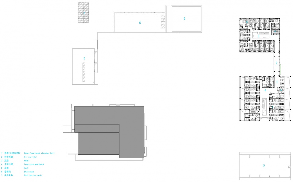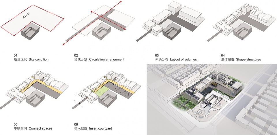 为了避免将整个建筑做的体量过于庞大,我们试图通过体块的错位穿插与高低错落的组合方式来构筑空间的构成元素,同时在体块与体块之间形成大量庭院与呼吸空间。通过虚与实的转换作为空间叙事脉络,用灰空间将不同的功能建筑主体与庭院空间形成自然过渡。