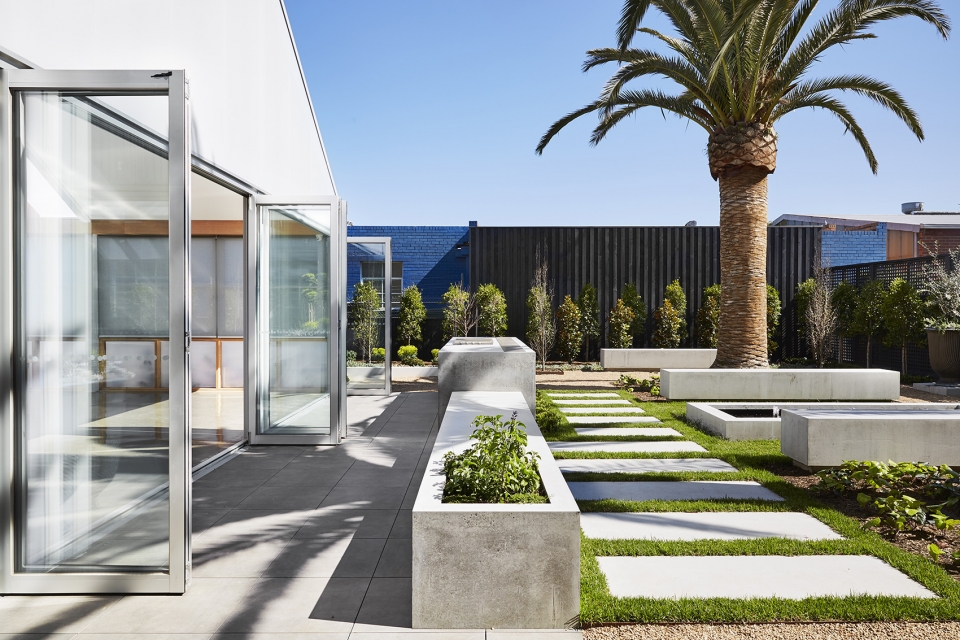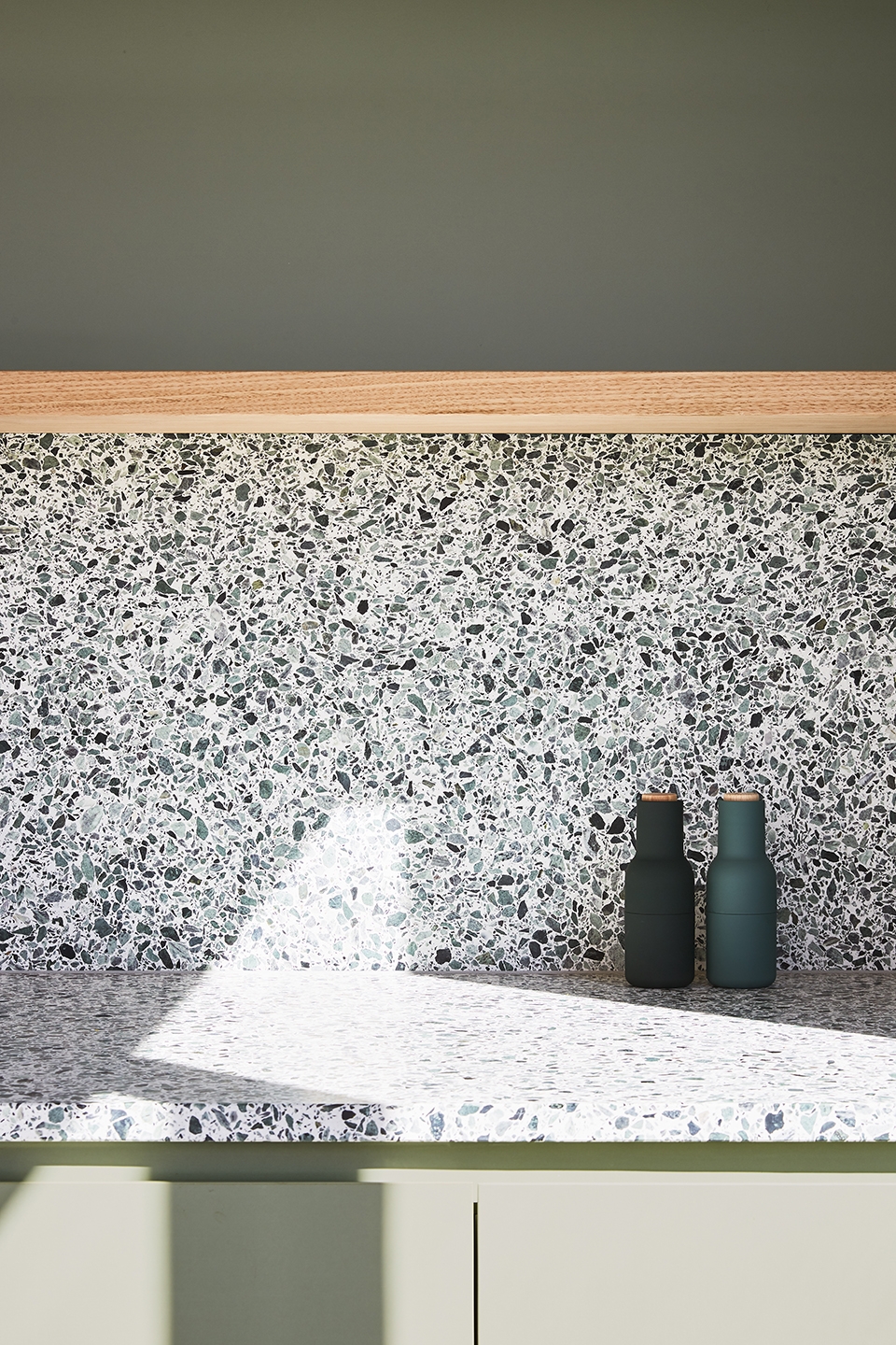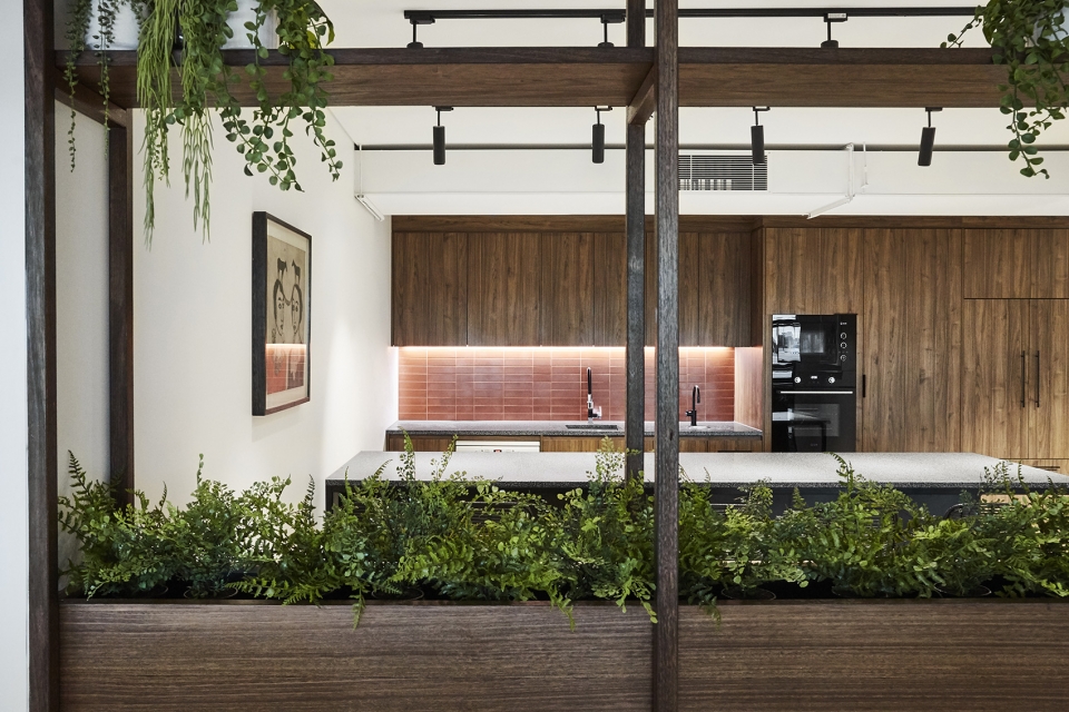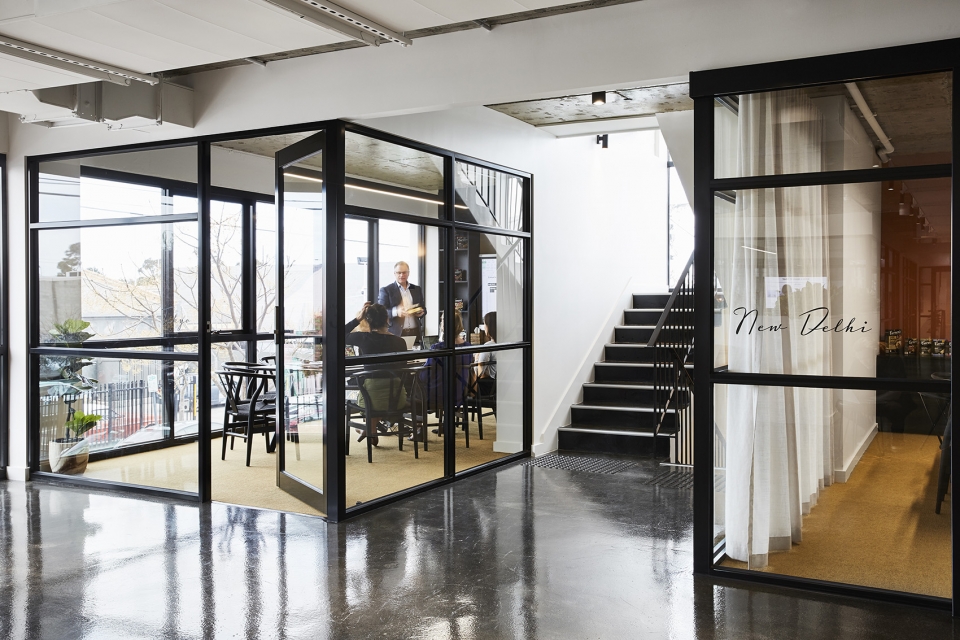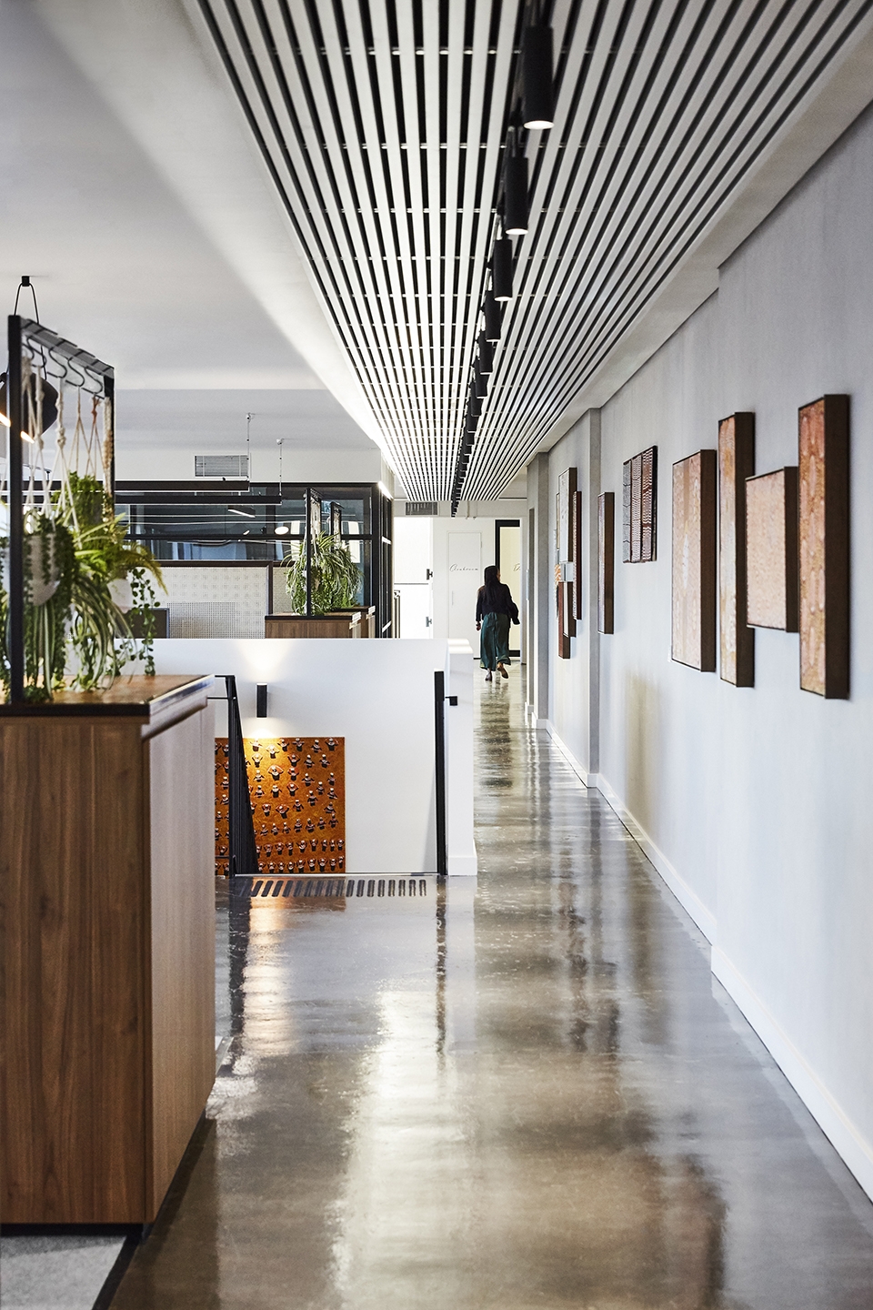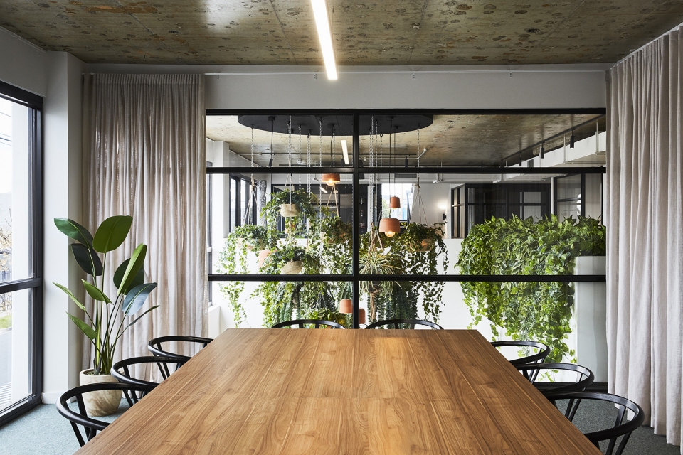 A tactile material palette layered with lush greenery, local art pieces and a diverse collection of Carolyn’s personal interior touches reinforces this nod towards residential design, while black metal glazed partitions and exposed concrete flooring are contrastingly modern.