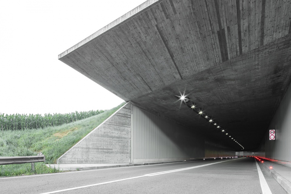 新的混凝土结构是由正在建造中的64公里长的Brenner Base隧道施工现场获得的骨料制成。隔音墙采用落叶松木制成,通风筒则采用了耐候钢,它们与裸露的混凝土结构共同构成了本次项目的核心要素,将景观、基础设施和交通枢纽的多重功能结合在一起,指示出地上层和地下层的交汇点,在融入Bressanone城市景观的同时也定义出一场独特而短促的行驶体验。