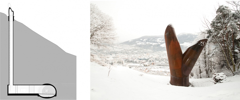 ▼通风筒剖面(左);冬天的通风筒(右),chimney long section (left); chimney in winter (right) ©MoDusArchitects + ©Leonhard Angerer