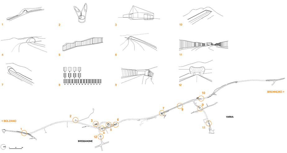 The design brief called for a series of interventions (tunnel portals, retaining walls, acoustic barriers, service substations, mechanical structures, ventilation chimneys, and various signage elements) along its entire length, and is guided by three simple design decisions. Firstly, the architects sought to minimize the environmental impact of the elements above ground in order to express both an architectural and technical quality. Secondly, these elements and those below ground were conceptualized into a unified, consequential design approach, and were calibrated to accommodate the particularities of the immediate site conditions. Lastly, the Bressanone and Varna tracts were pulled together into one continuum whereby the two townships are no longer conceived as distinct contexts but as two parts of a greater whole.