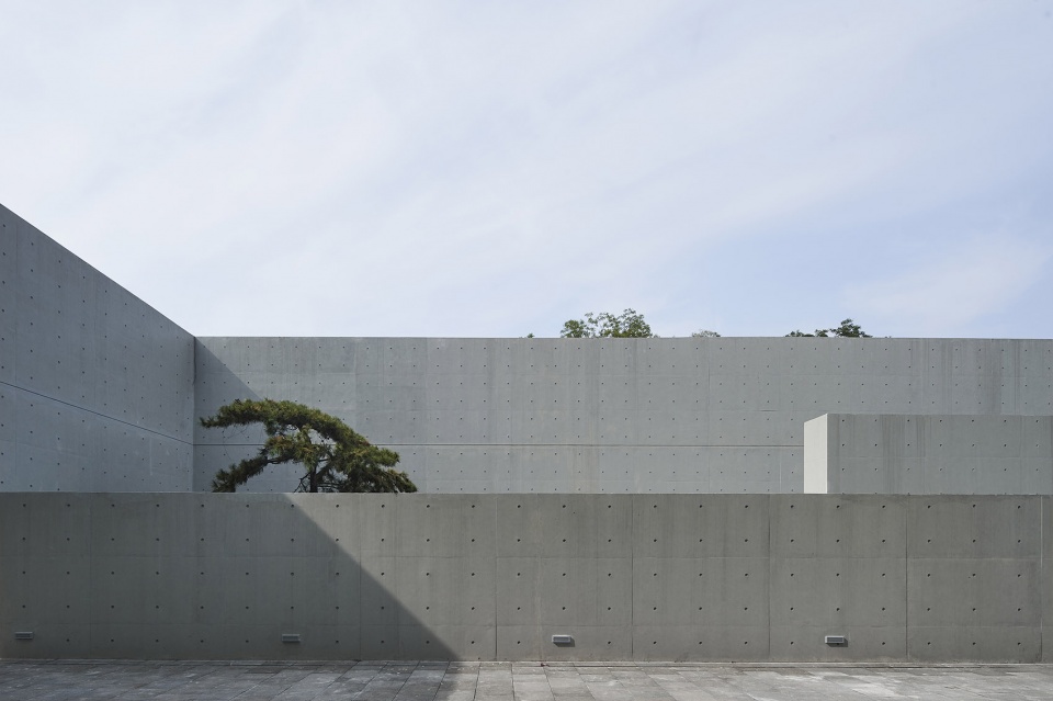 ▼下沉庭院边缘的“清水”片墙,the faced concrete wall of the sunken courtyard ©魏刚