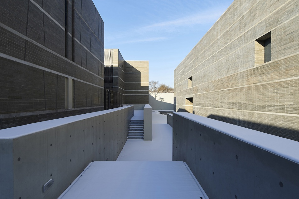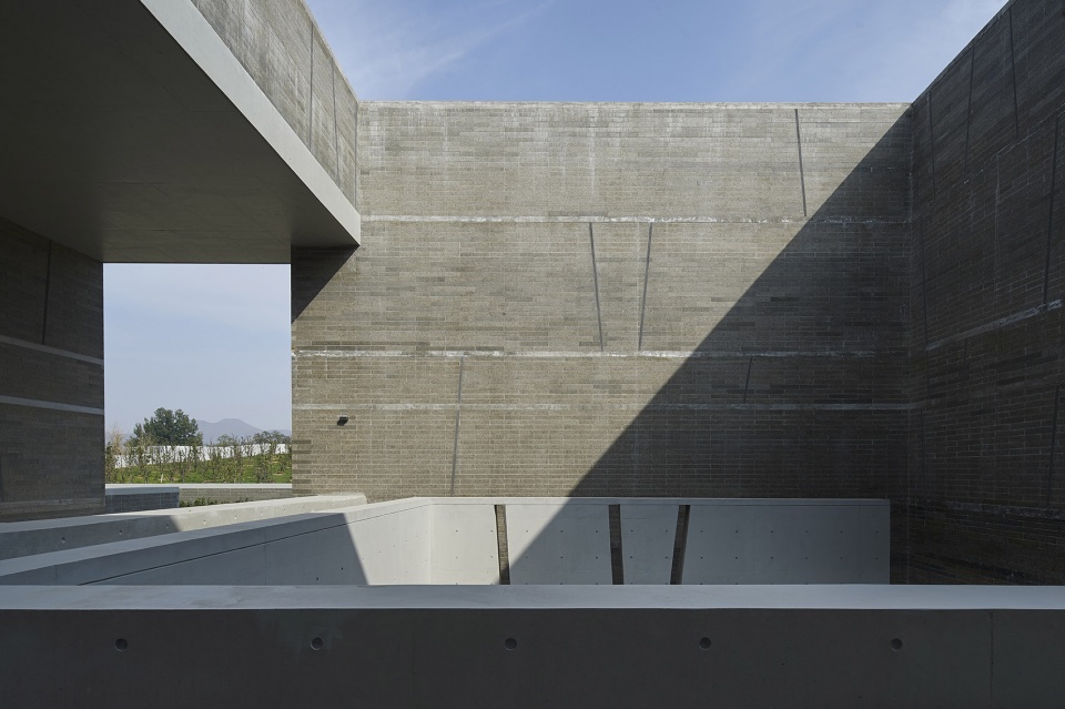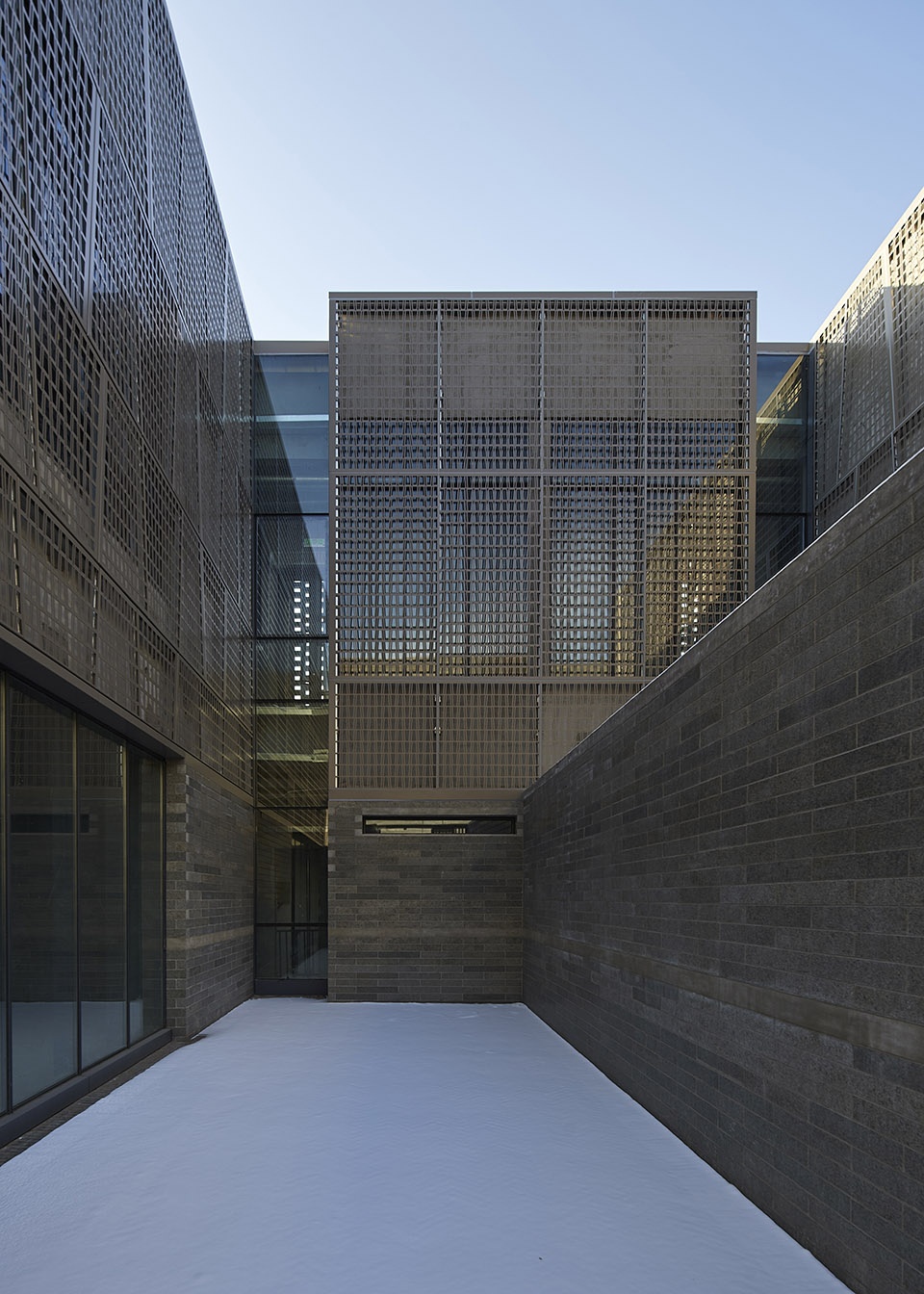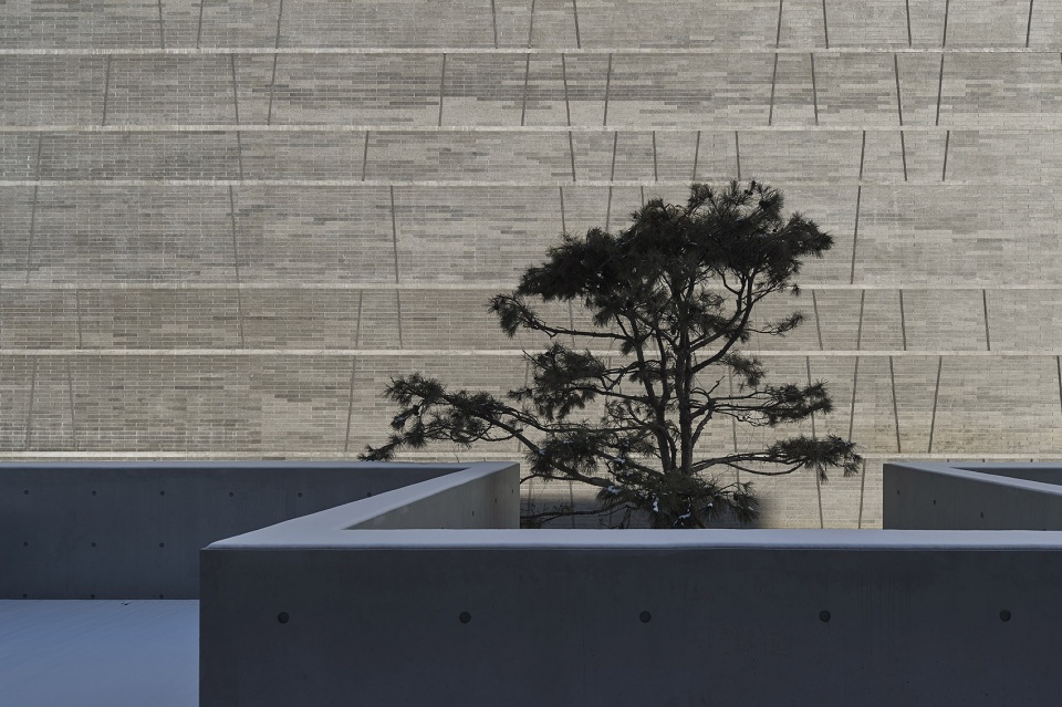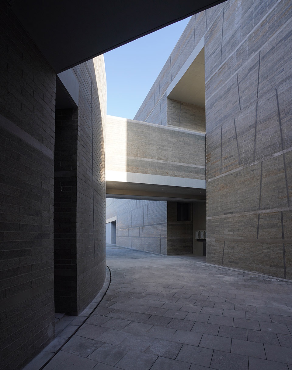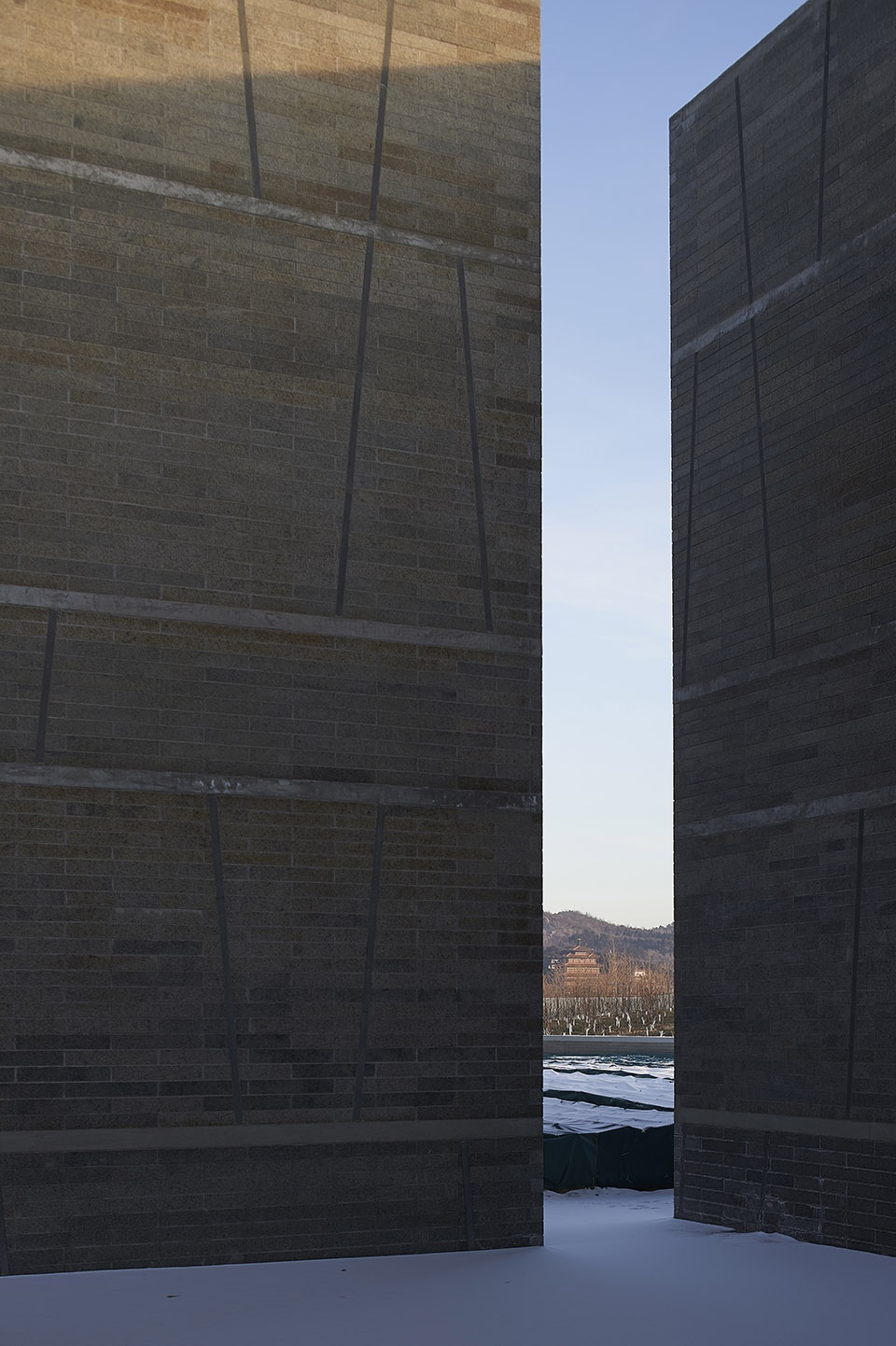The facade is staggered with “Chengde Green” stone according to the specifications of the ancient bricks, and poured strip fair-faced concrete in the brick wall as horizontal lines. Between the lines of the wall are embedded with many left and right inclined finished cement strips, which interrupt the horizontal masonry texture. These inclined lines originate from history.