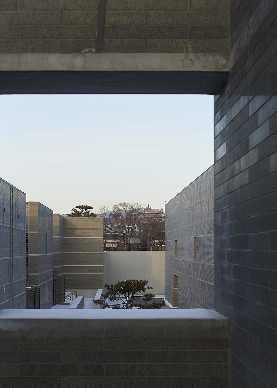建筑外沿由“承德绿”石材依循古代大青砖的规格错缝砌筑,并结合承托石材的结构体系用清水混凝土勾勒出间距不等的水平线条。墙面的水平线条间,嵌入了许多左右倾斜的成品水泥条,打断原本规则平实的砌筑肌理,这些倾斜的线条来源于历史。