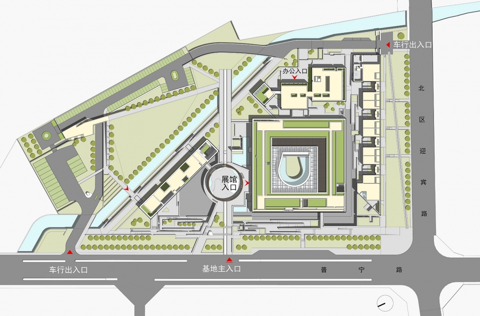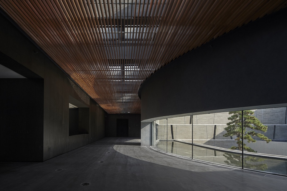 建筑内部空间在深色哑光墙面的映衬下暗了下来,但并不使人感到压抑。这是因为在入口前方结合中庭做了大面积的弧形落地玻璃窗,明亮的光线吸引了人的视线。玻璃窗外是一个“藏”在展馆中心的室外庭院,沿弧边布置了宽窄不一的浅池,池水倒映着天空、树木和建筑,营造出一种静谧的意境。