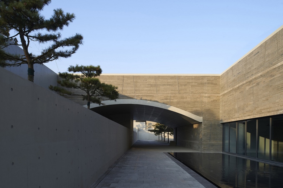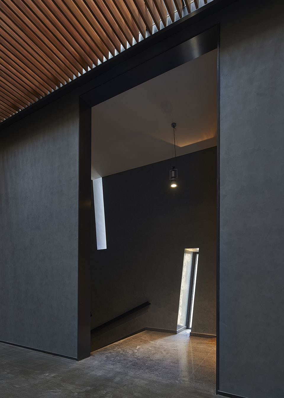 The interior spaces of the building are darkened by the dark matte walls, but it does not make people feel depressed. This is because a large area of arc-shaped floor-to-ceiling windows is made in front of the entrance in conjunction with the atrium, and the bright light attracts people’s attention. Outside the window is an outdoor courtyard “hidden” in the center of the pavilion. A shallow pool of varying widths is arranged along the arc edge. The water reflects the sky, trees and buildings, creating a tranquil mood.