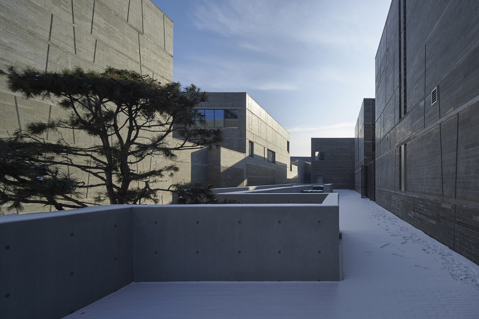 Qing rulers believed in Lamaism and built many Tibetan-style temples outside the Mountain Resort. This large-scale Tibetan building complex is unique outside the Tibetan area. It can be said to be the most special form of ancient buildings in Chengde. The classic element of Tibetan architecture is the trapezoidal window. Therefore, this element was abstracted into a new design language. In addition to the use of inclined strip fair-face concrete on all masonry walls, a “trapezoid” was also directly used on some walls.)