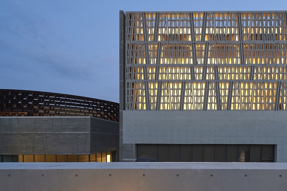 例如,在西侧沿街高出道路标高的建筑主立面上,用玻璃纤维增强水泥(GRC)装饰板,做了一整面“大梯形套小梯形”的透空花格墙,如古建筑中的窗棂一般将光线引入室内。