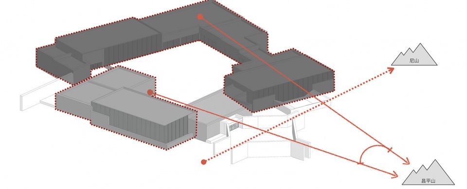 对历史的敬畏和对环境的尊重是我们设计的出发点。尼山,是具有灵性的,“不宜动山”是合作的景观设计师庄先生的好建议。设计中尽可能的将建筑旁的尼山与远处的昌平山纳入我们的所创造的环境中。同时将尼山与建筑相融合,让建筑成为山体的一部分一直是我们努力的方向。