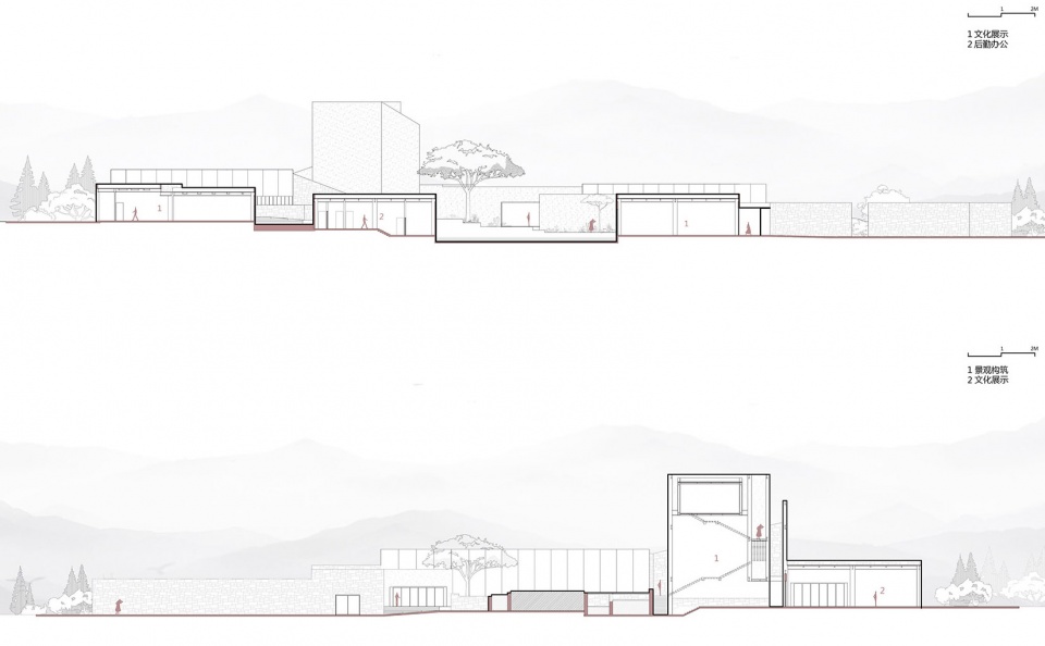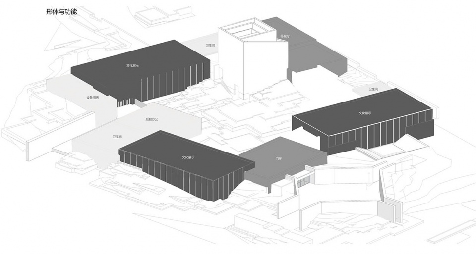 《千字文》里说,“空谷传声,虚堂习听”。中国建筑的核心不是建筑实体,而是空间虚体。我们将所有功能围绕一个精彩的庭院展开,庭院中面向昌平山设置观景塔,让到访者在此见证圣人诞生地。建筑空间布局借鉴传统的“廊”串“堂”的布局方式,将三大功能空间(售票大厅、展示大厅、休闲大厅)作为主要的“厅堂”。这种方式即保留传统空间营造中最精妙的部分,也摆脱了传统等级制度下的生硬布局方式。排布中将这三个主体空间根据与尼山和昌平山的视线关系具体布置——“售票大厅“视线穿过中庭可远眺尼山主峰;“展示大厅”只在朝向昌平山的方向形成大面积落地窗,结合室外景观与昌平山形成具有纪念意义的场所;“休闲大厅”朝向内庭打开,回程游客可在庭院中遥望昌平山。
