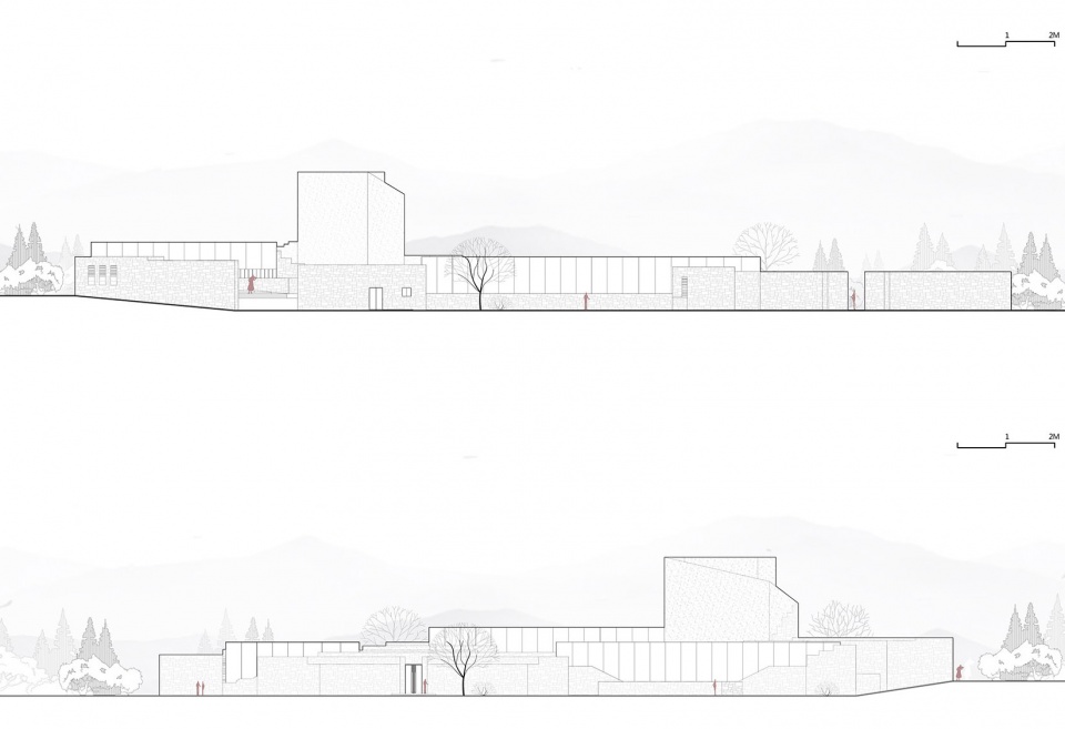 According to The Thousand Character Essay, “The empty valleys broadly resonate, in hallow halls wisely officiate.” The kernel Chinese architecture is open voids rather than solid mass. All functions are around a gorgeous courtyard, and a landscape tower where visitors can witness Confucius’s birthplace is constructed in the courtyard in the direction of Mount Changping. We have drawn lessons from traditional distribution of corridors and halls in terms of the spatial distribution of architecture and take the three functional spaces (Ticket Hall, Exhibition Hall and Leisure Hall) as the main hall, which not only retains the cream of traditional space construction but also gets rid of the rigid layout in the traditional hierarchy. These three functional spaces have been arranged in terms of their line-of-sight relationship with Mount Ni and Mount Changping. One can look the main peak of Mount Ni in the distance through the atrium from “Ticket Hall”; only in the direction of Mount Changpibg, are large french windows, with which outdoor landscape and Mount Changping forms a memorable site, mounted in “Exhibition Hall”; “Leisure Hall” is open to the patio, so tourists are able to look Mount Changping in the distance in the courtyard.