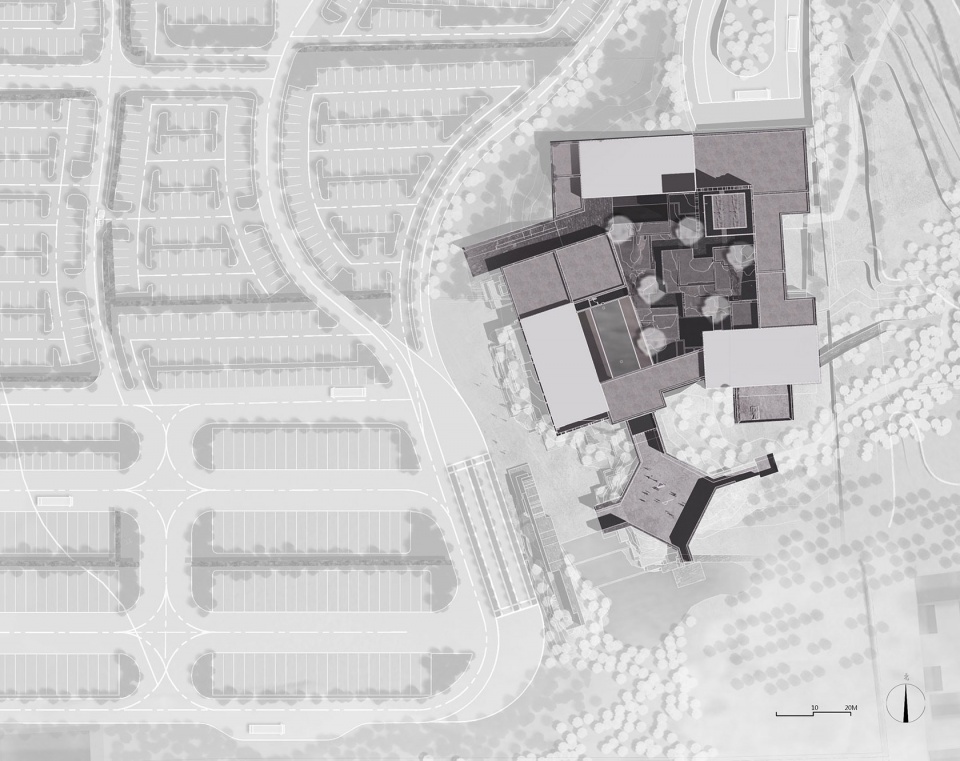 人与自然主观艺术性的对话,是中国文化中非常精彩的部分。因此在设计中我们特别注重了建筑与尼山峰顶;建筑与昌平山的视线通廊,并在两条视线的交汇处围合形成建筑入口的方场,更以此形成两套轴网,以表达对自然的所有敬意。