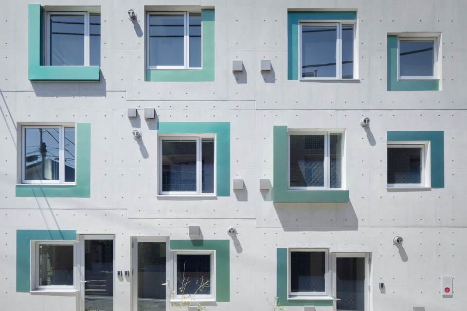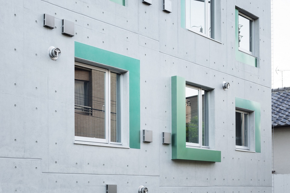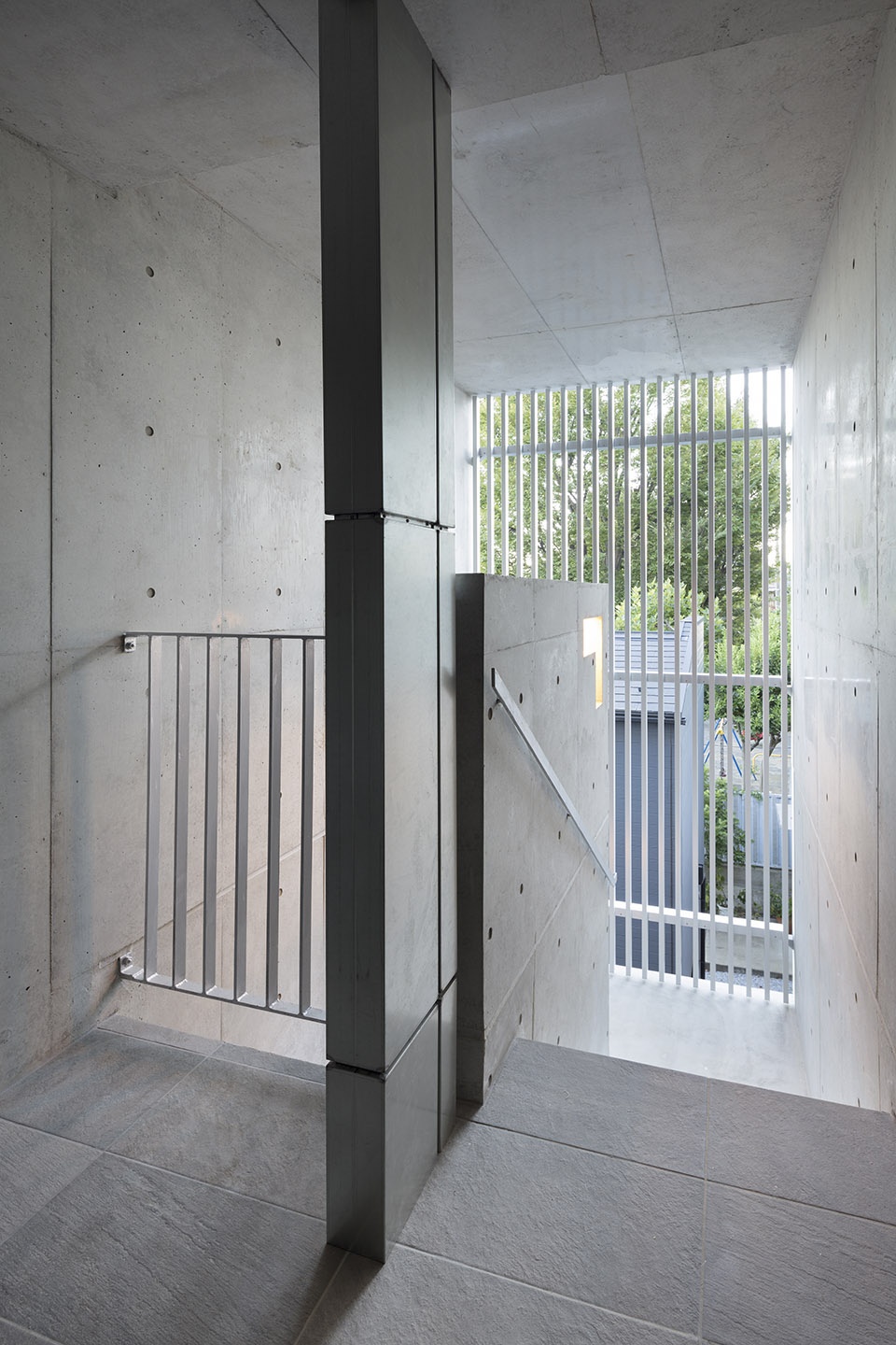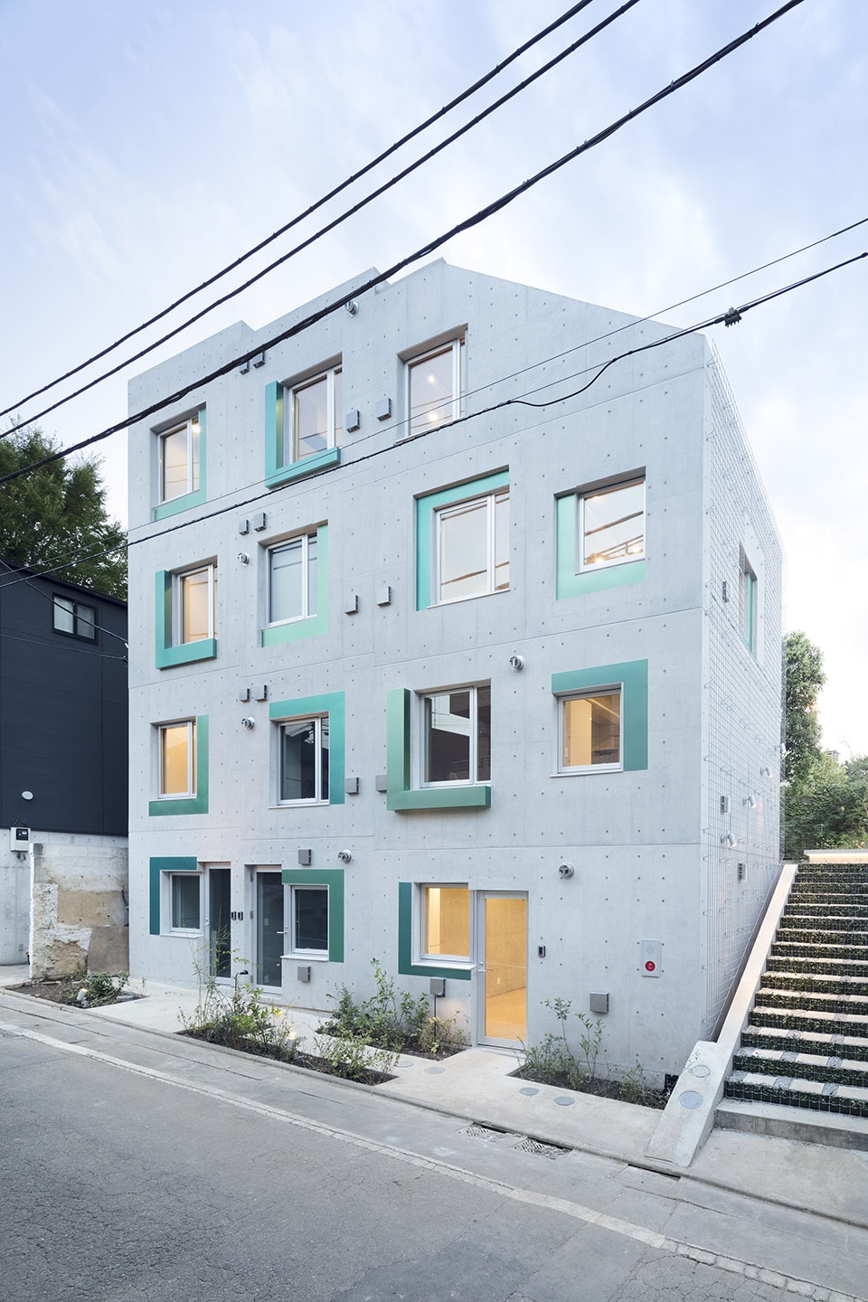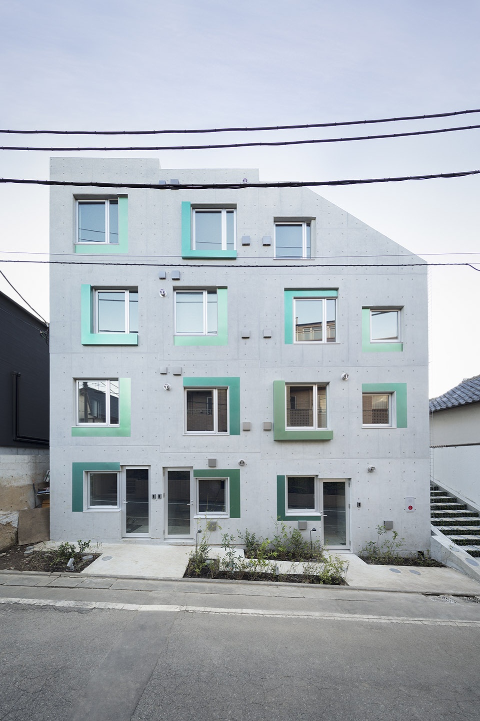 Daita Project is a residential complex consisting of 16 apartments located in a quiet residential area close to a main road in Setagaya-ku in the Western part of Tokyo. The site is located in a hilly area dotted with L-shaped mansions surrounded by trees.