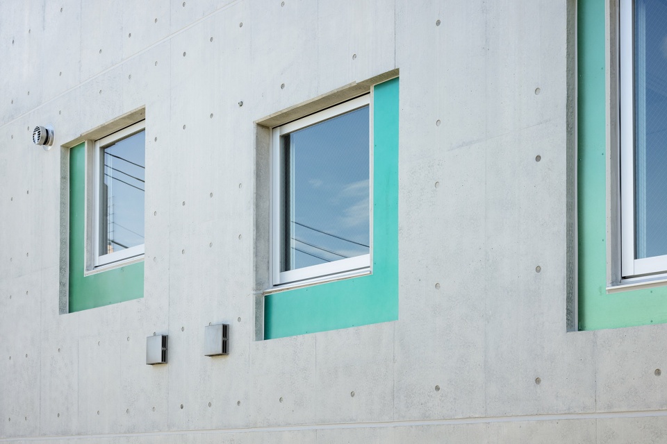 ▼立面点缀L型绿色窗框,L-shaped green window frames dispersed along the facade