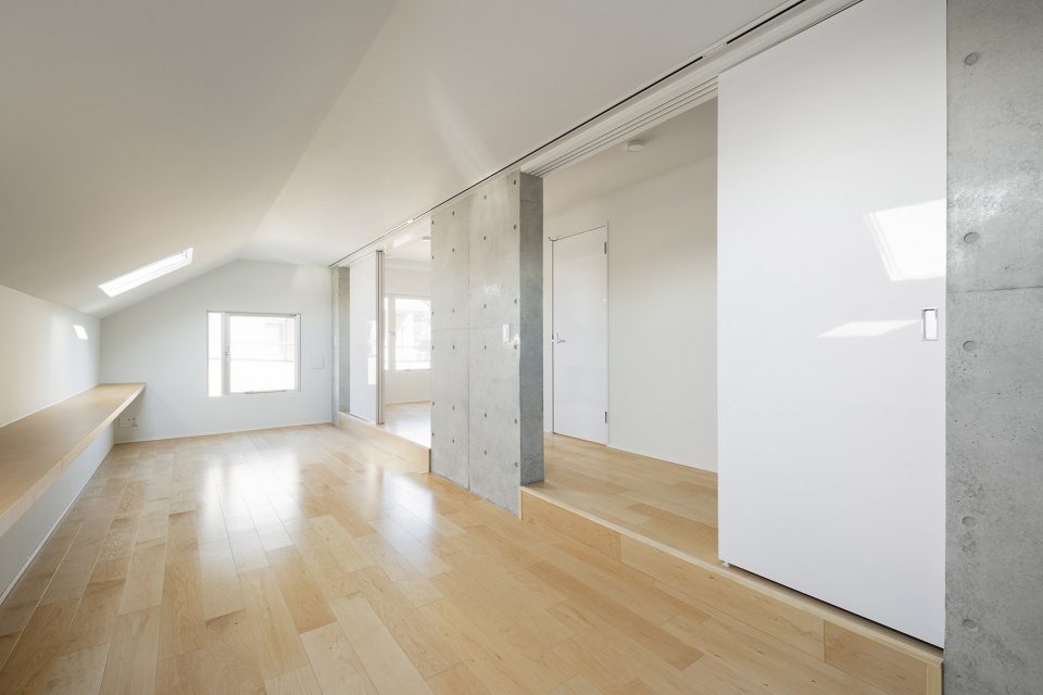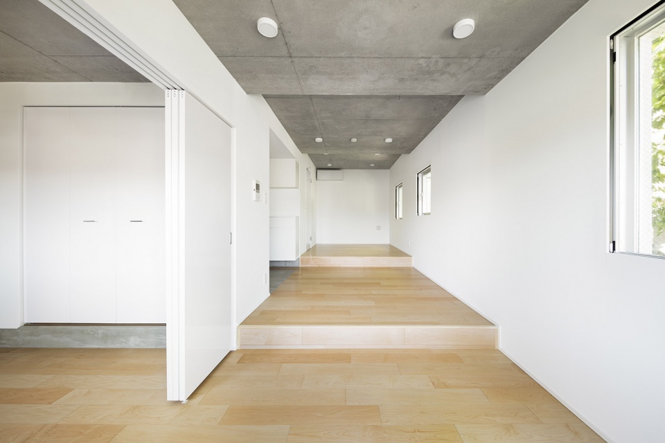 The dwelling units combine a simple design with little wasted space which allows for a variety of flexible configurations. This is expressed by the contrasting white paneled and bare concrete walls. A series of steps within each of the spaces creates a relationship where living, dining and bedrooms can be changed by the residents. In addition, an L-shaped self-supporting wall has been designed to be used as a walk-in closet or perhaps as a compact PC booth.