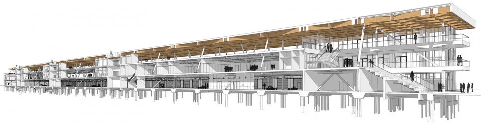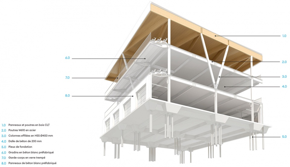 To facilitate the completion of the $50M project within the 10 months separating the next two editions of the Grand Prix, the building is an assemblage of prefabricated parts including, concrete panels, steel beams and columns, CLT wood beams and panels, curtain wall and demountable partitions. It can also be dismantled and the material reused in case of termination of the car racing event.