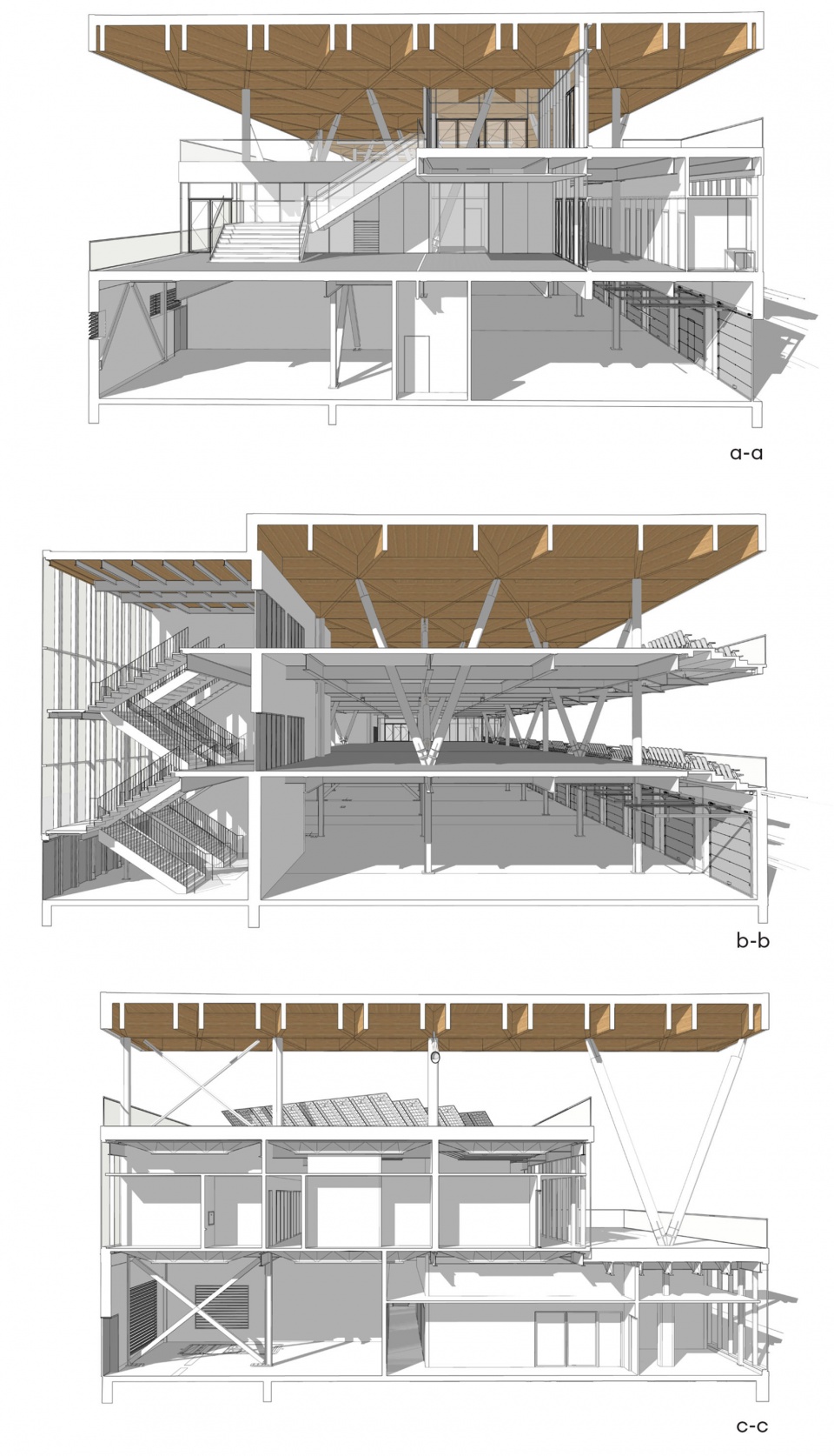 In contrast with other international Grand Prix, lounge areas have no exterior walls and no air-conditioning, finishes are bare, solar panels provide electricity for lighting and the building tries to make responsible use of public money. The roof structure will distinguish the Canadian edition and give it an identity based on our collective desire to make a better use of one of our most important natural resources, reminiscence of the daring structures of Expo 67, and commitment toward sustainable development.
