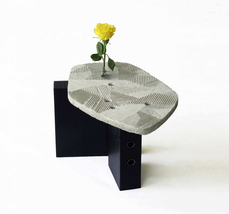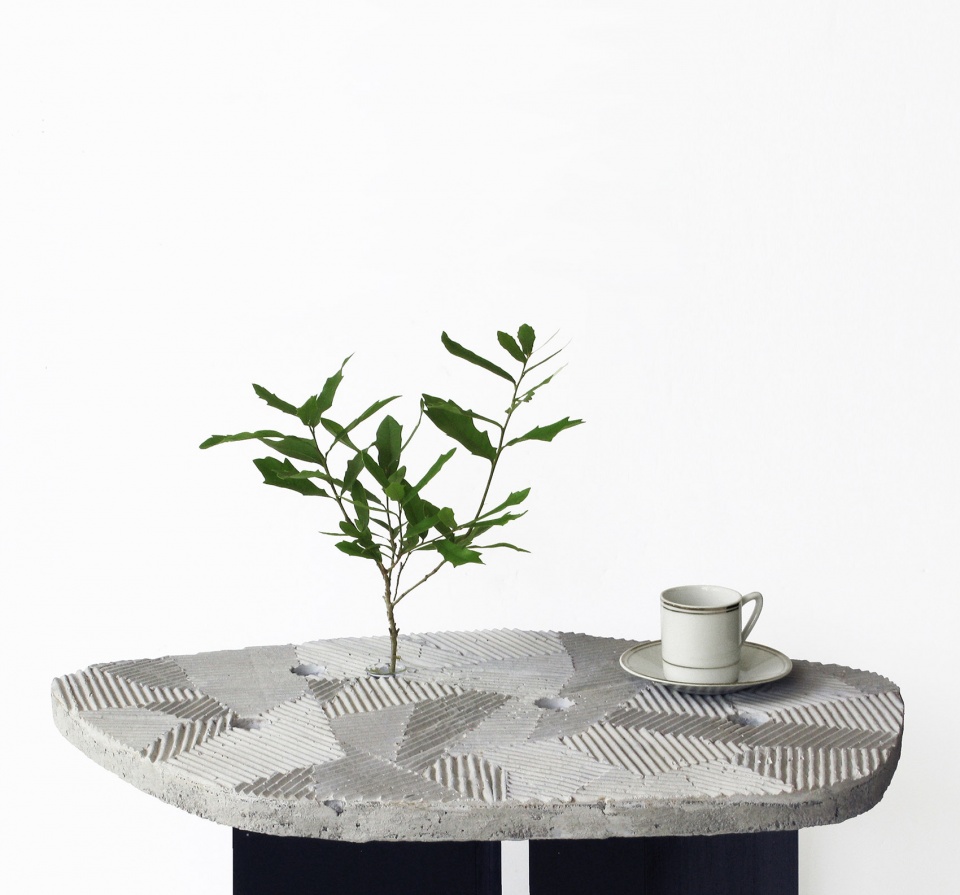 桌子的设计灵感来源于枯山水庭院中的地面肌理。平行的线条围绕着精心摆放的石块或树木,使人联想到开阔水体中的岛屿——FURROW桌子上随机排列的几何图案正试图捕捉这种禅意。台面上的圆洞可以插入玻璃管,并在立面放上一小株切花、树枝或叶子,为桌面空间置入一个微观的园景。