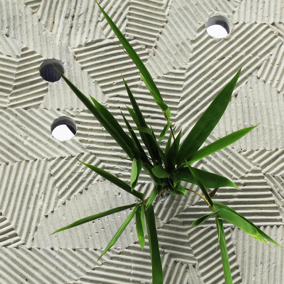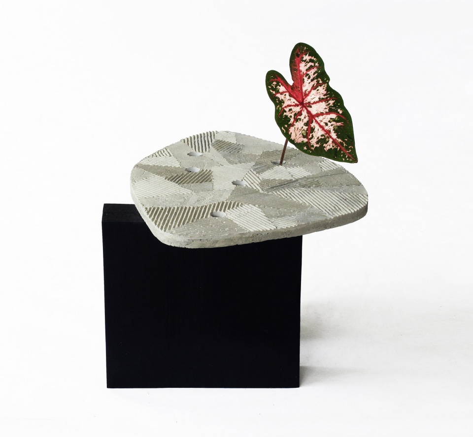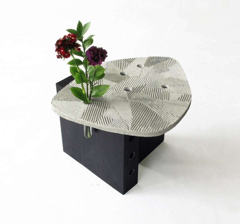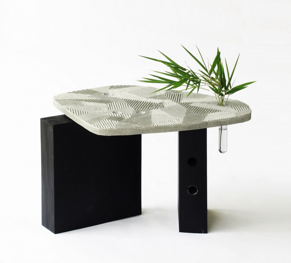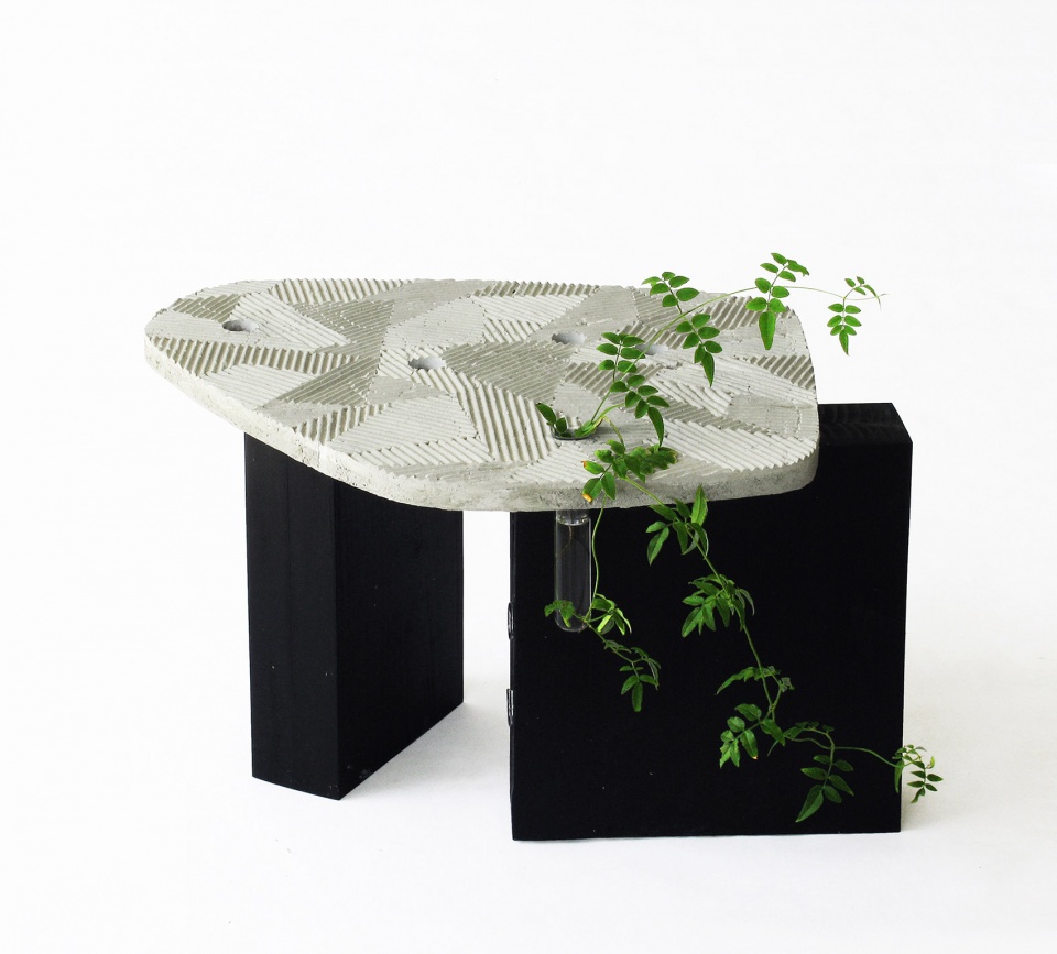In Zen garden, the sand on the ground is scored with parallel lines pattern around the carefully positioned stones or trees, evoking the image of islands amidst the vast body of water around them. The randomly laid out geometric pattern on the surface of FURROW tries to capture that sensibility. The holes on the surface are for the glass tubes to go in. These glass tubes suspended from the surface hold water, which can hold cut flowers, small plants, and perhaps a small branch from a tree, enhancing the microcosmic sense of landscape to the space on the tabletop.