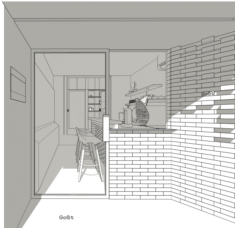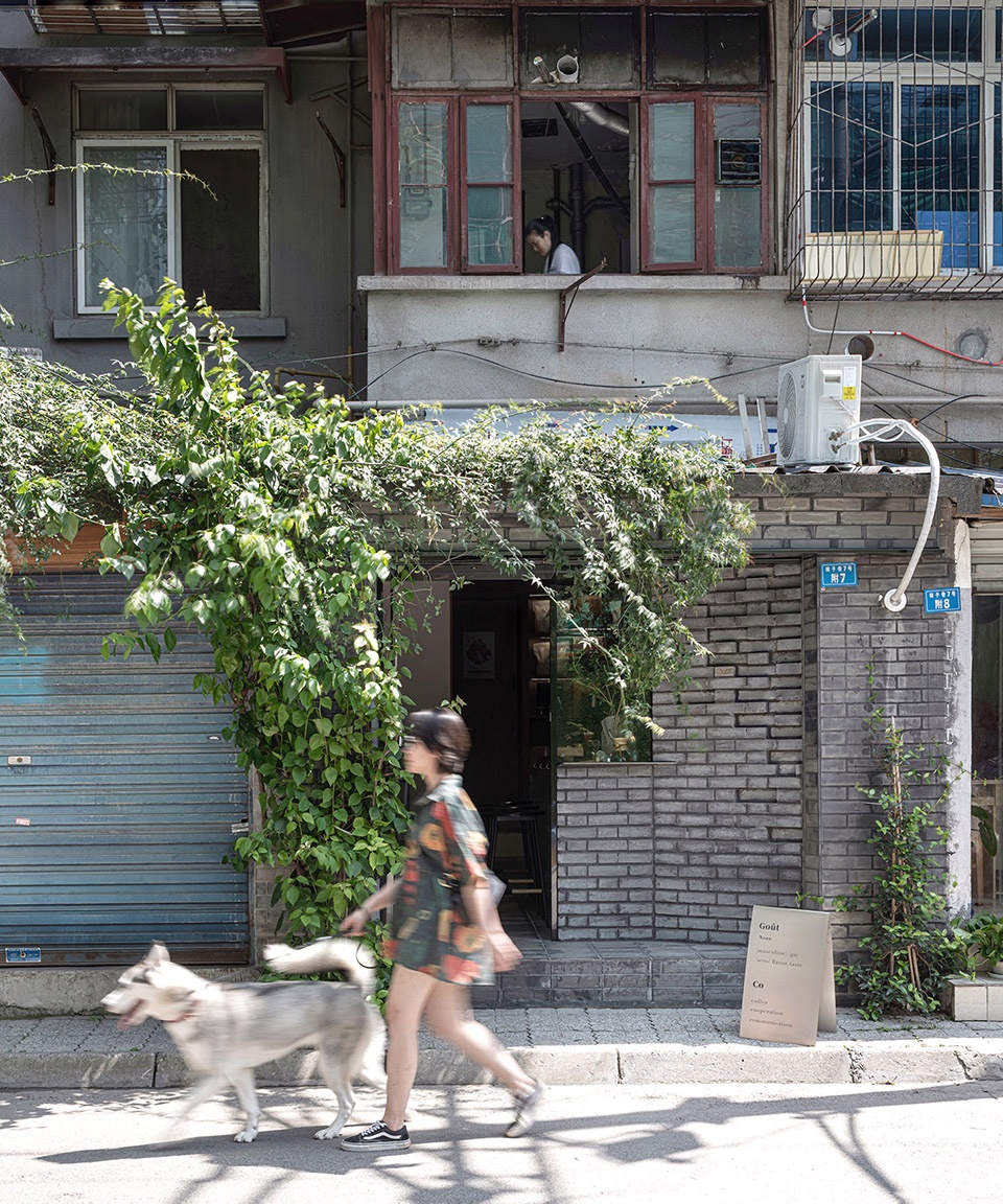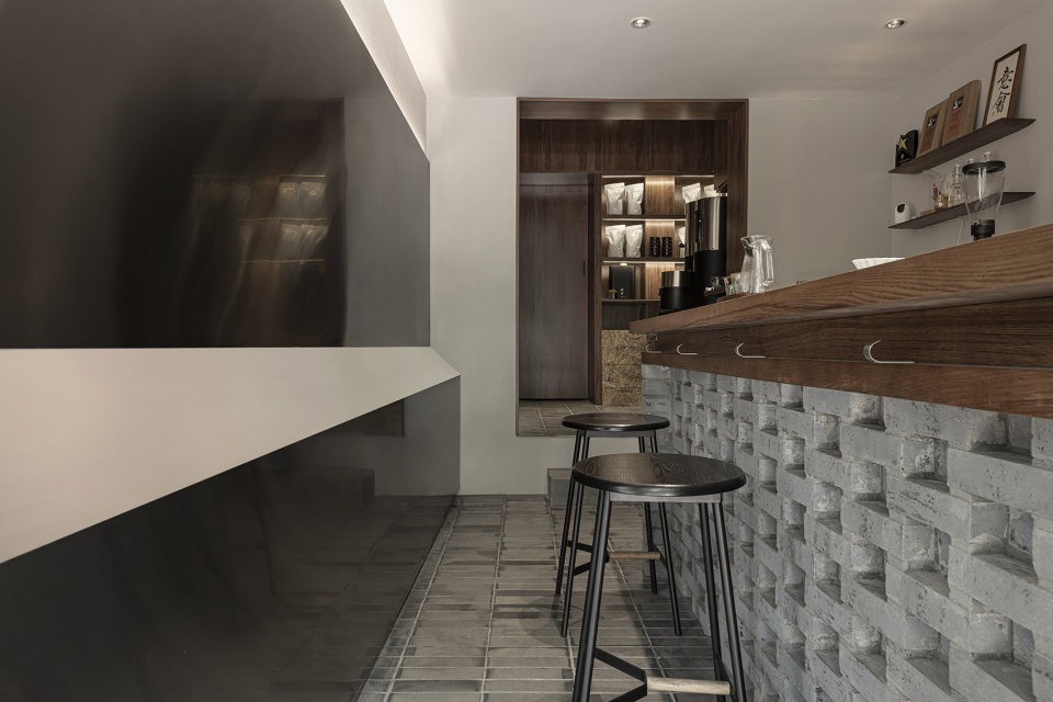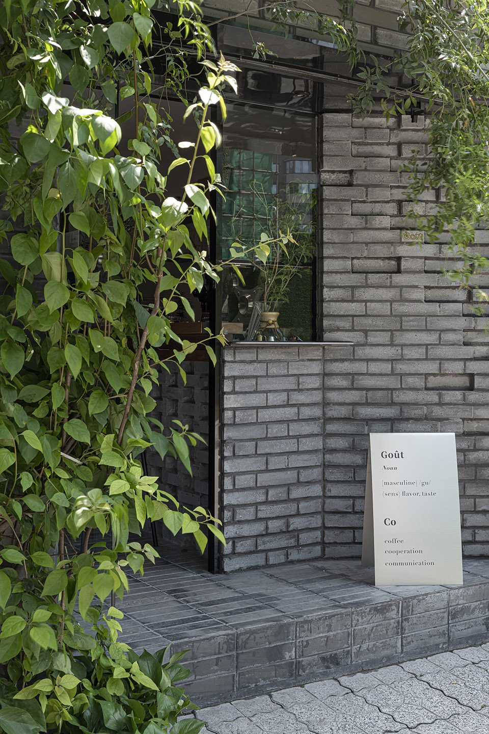 Green brick base into the bar, sitting on the stainless steel surface in the visual to give some sense of extension. The materials on the facade should be used to distinguish the bean baking area and the outer room, so as to strengthen the spatial level. The entrance, tasting area and bean baking area present a progressive relationship. The front of the door is blocked to give people a sense of mystery and enrich space vision. The green brick elements in the alley are extracted to make the shop more local. The door is concave and hidden in plants and brick walls.