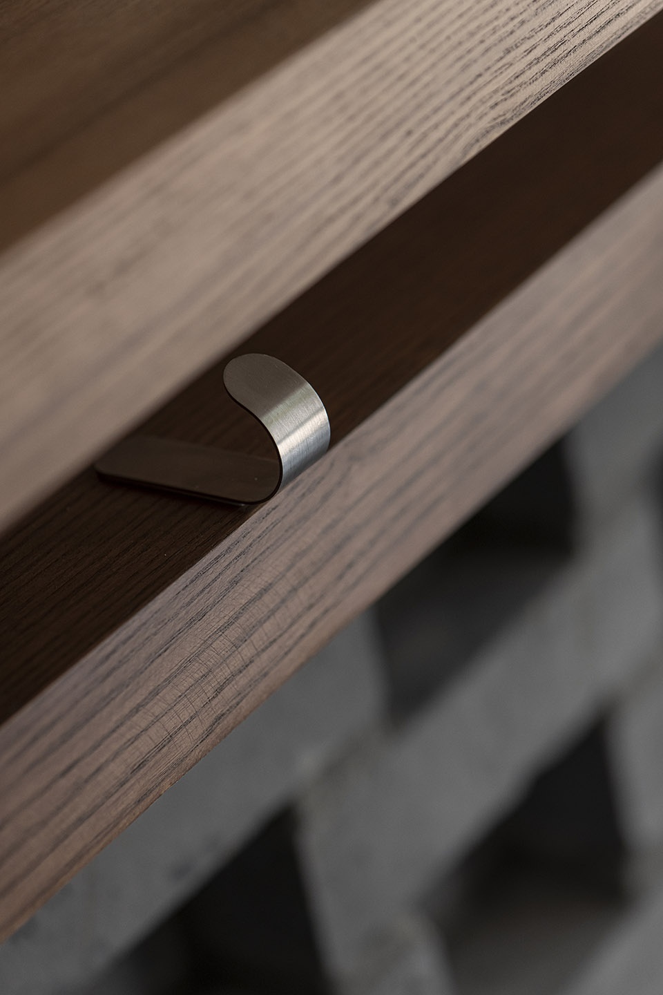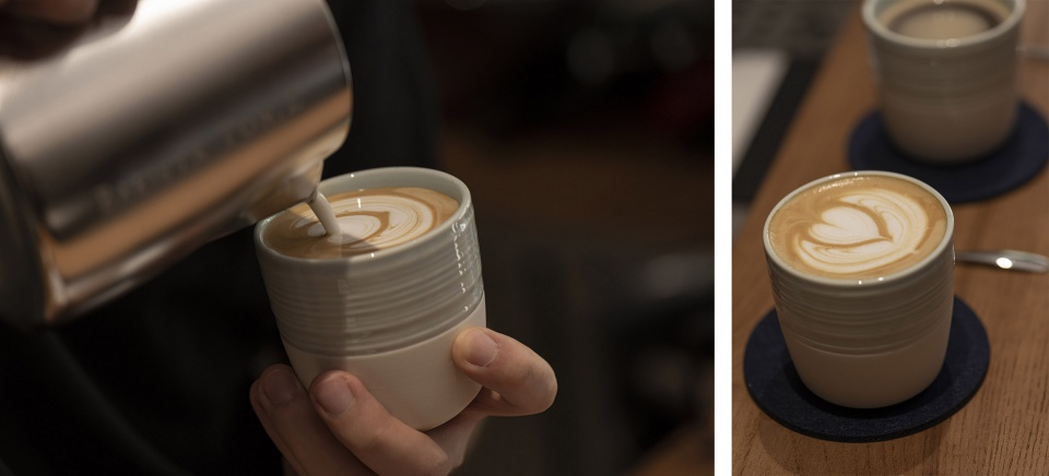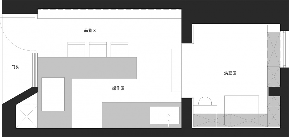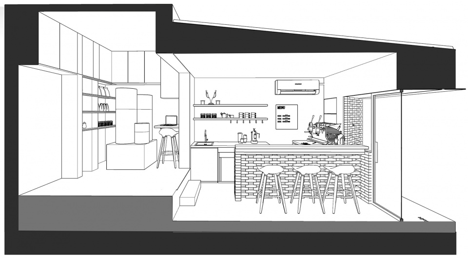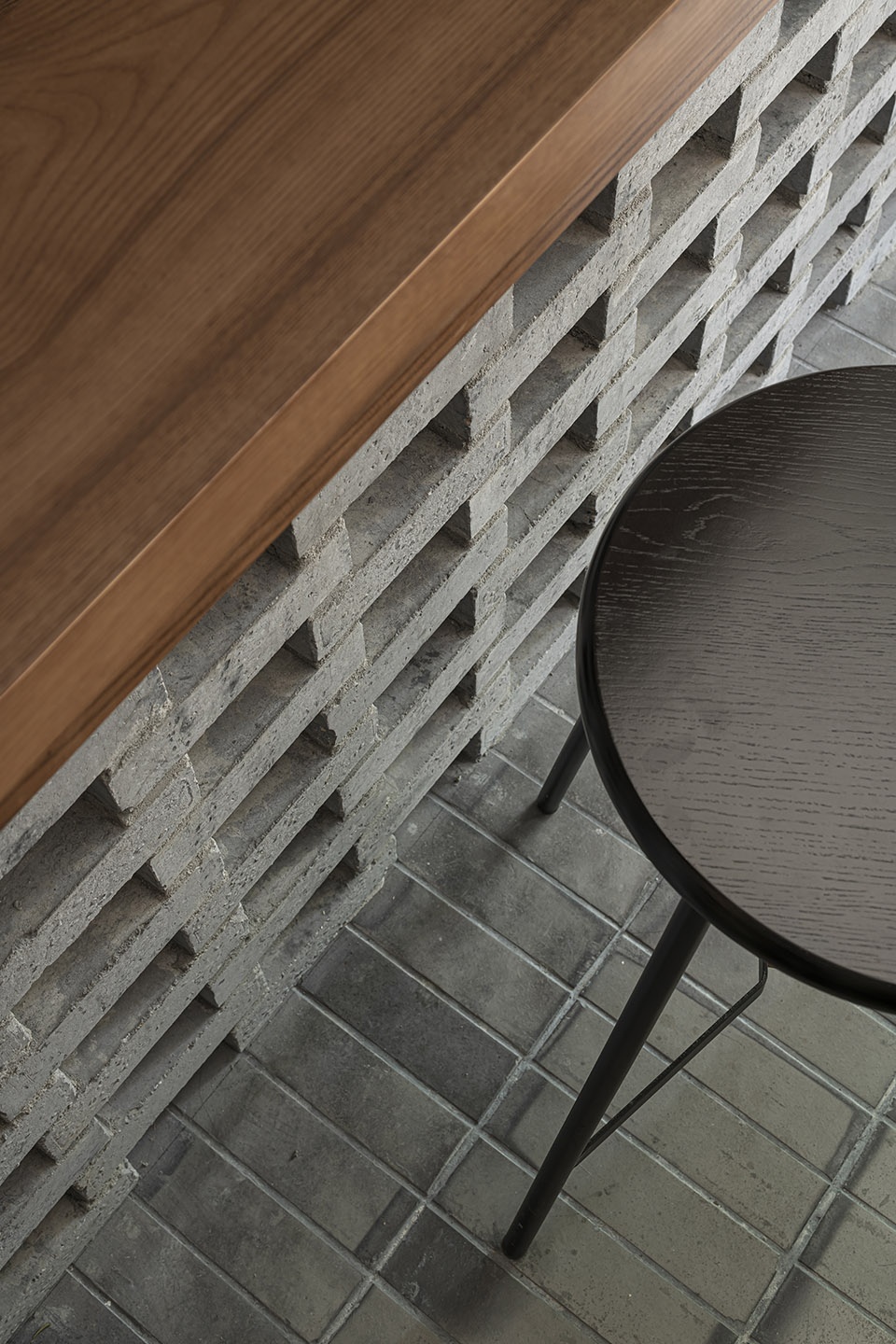 吧台拉近客人与咖啡师之间的距离,便于交流。但座位着实有限,固利用墙体做造型让人可以靠坐,缓解就坐压力。烘豆区整体木色,加上户型本身的抬高,视觉上呈现出“盒子”的状态,让烘豆这个空间成为独立的存在,暗示“烘豆”这一过程的仪式感。