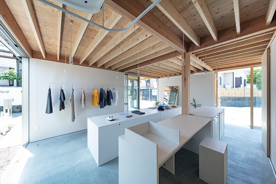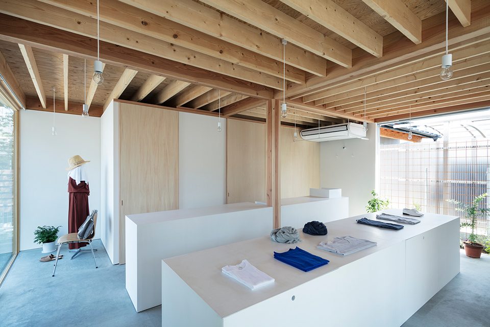 The first floor houses a shop where the building’s owner sells clothes and miscellaneous items made from natural materials, intended to be used and loved for many years. The second floor is a light- and breeze-filled space where the owner’s mother lives. Our goal was to clearly separate the shop from the residence upstairs while still allowing the users of both spaces to feel each other’s reassuring presence. The resulting structure is slightly different from a typical multi-generation home; instead, a simple, compact square form contains space for two generations to work, live, and keep an eye on one another.