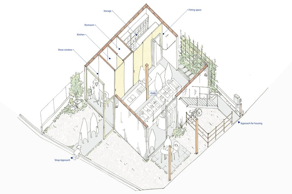小屋的首层是一间商店,房主在这里售卖用天然材料制成的、可爱且经久耐用的服饰。二层楼供房主的母亲居住,充满阳光与微风。设计师的目的是将商店与楼上的起居空间进行明确的分割,同时还要使家人们能够踏实地感受到彼此的存在。最终的设计与传统意义上的多代住宅略有不同,其简洁而紧凑的体量为两代人提供了工作、生活以及相互关照的空间。