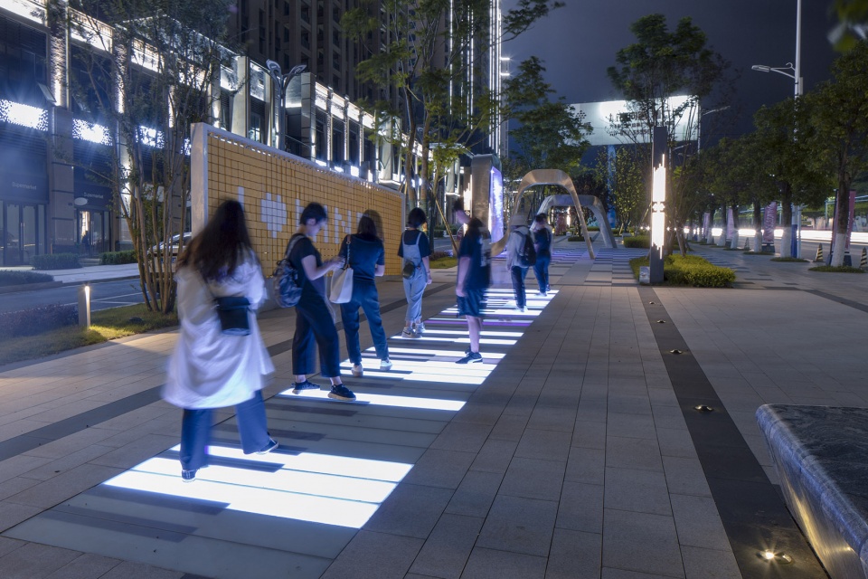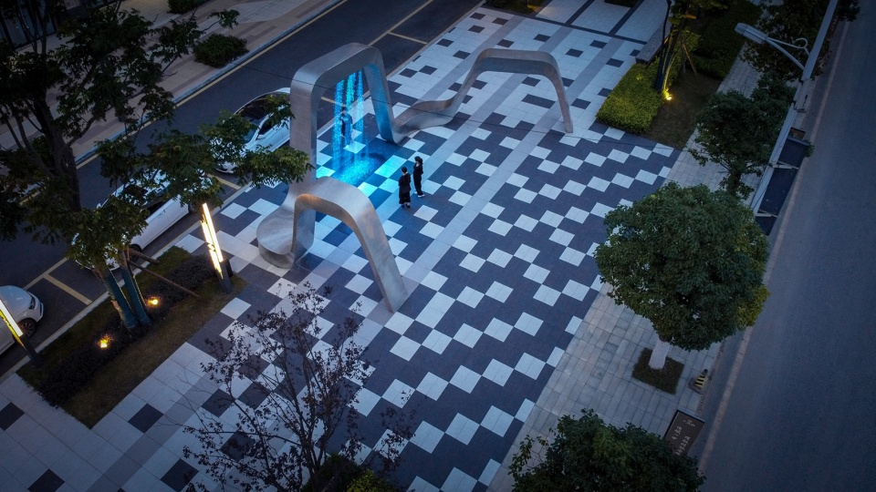 数控流水艺术装置,作为重要节点空间的核心亮点,驱动场地活力,聚集人气。地面运用参数化铺装,加强空间的视觉张力,同时提供一个趣味性的停留空间。场地内全部采用仿石砖铺贴,保证了色彩统一度,耐磨,避免了返碱等石材问题。数控流水装置在夜晚灯光的烘托下呈现出不同的色彩和图案。夜晚变成了社区喜爱的生活剧场。