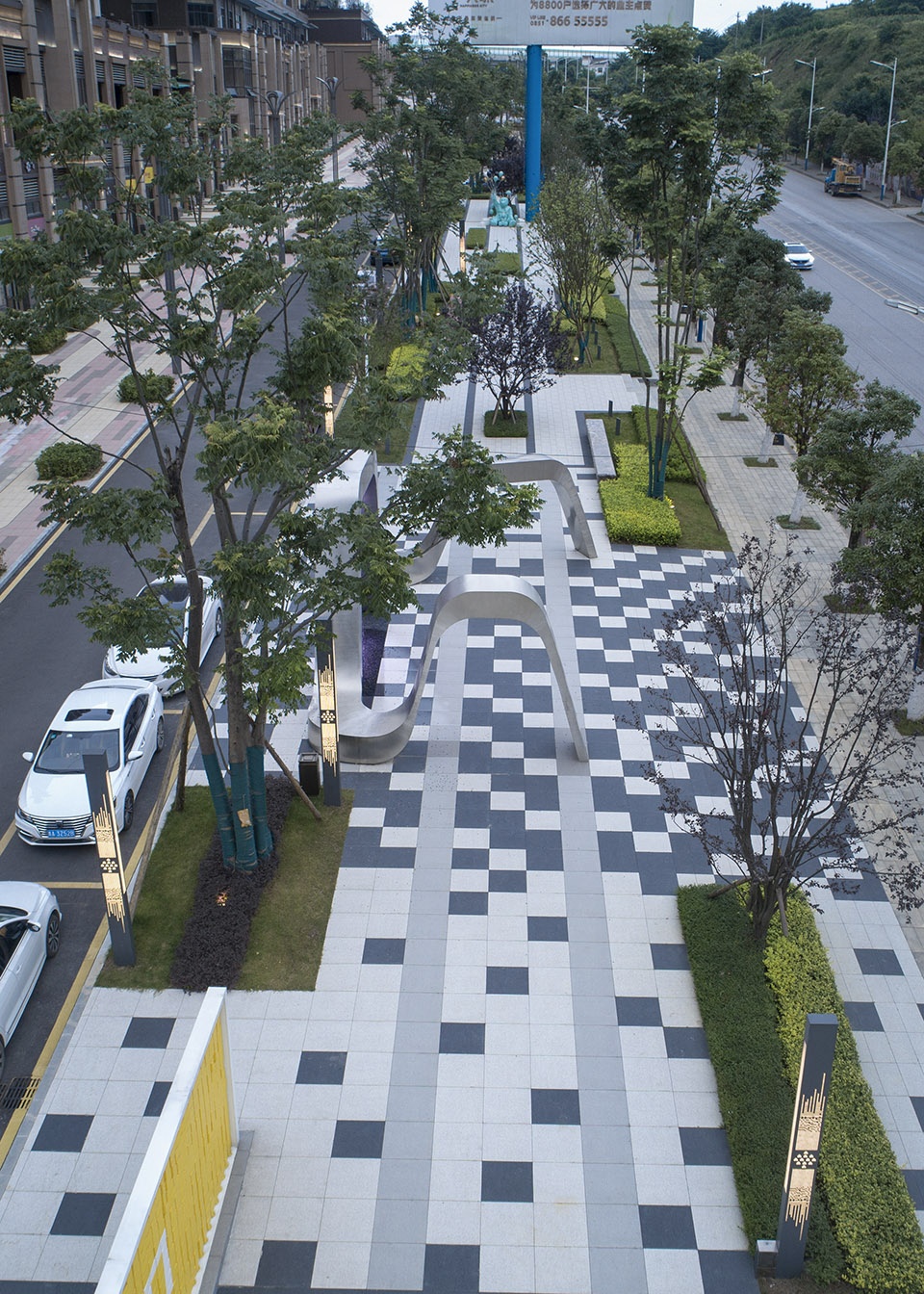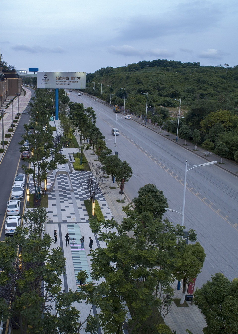 该项目位于贵阳以西清镇市,场地长度约350M,自东向西竖向高差13M,原貌为社区与城市相隔离的纯绿化空间,我们建议将其开放化,变成人人都能参与其中的公共属性场地。场地中增加互动休闲设施,让其变成充满活力的城市空间。它将是一个连接社区与城市主干道的线性街头公园,它用复合式的“拉链”结构,将不同属性的功能空间联系起来。