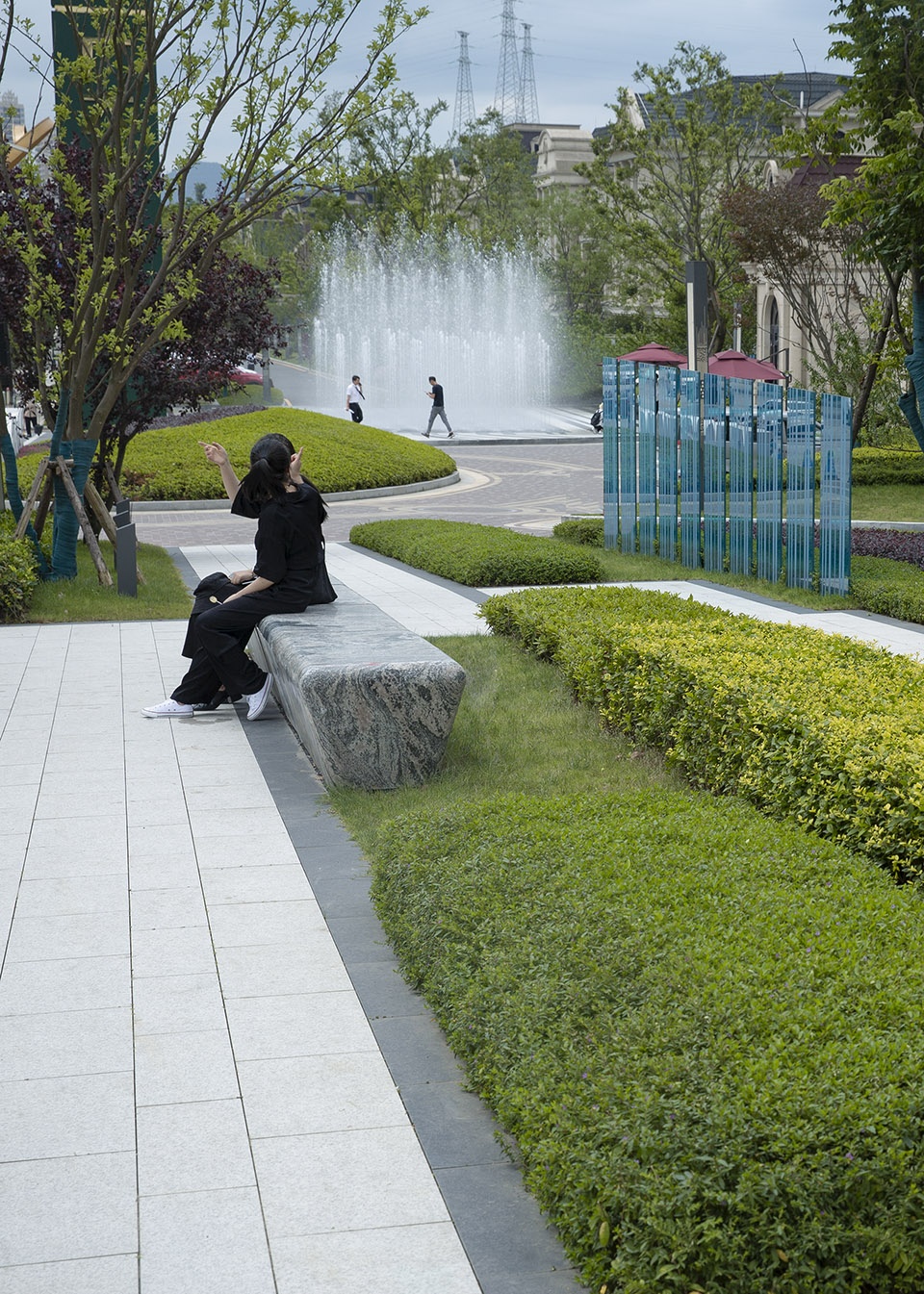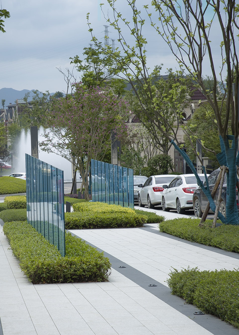 Tall trees provide comfortable greenery for the site.The neatly trimmed ground cover plants are beneficial for maintenance, and the addition of a glass landscape wall enriches the landscape level in the depth direction. The seat provides a small scene space for people to rest.