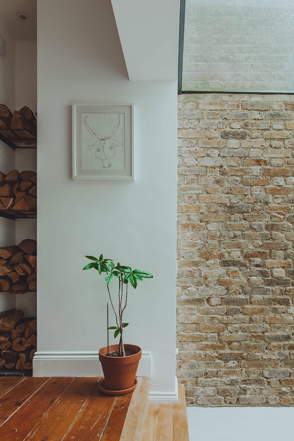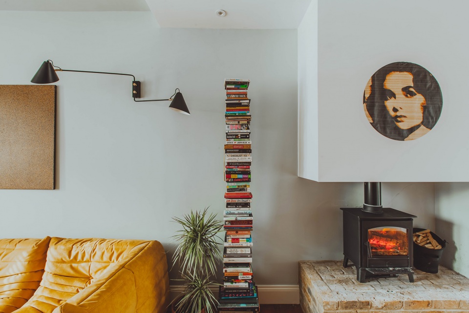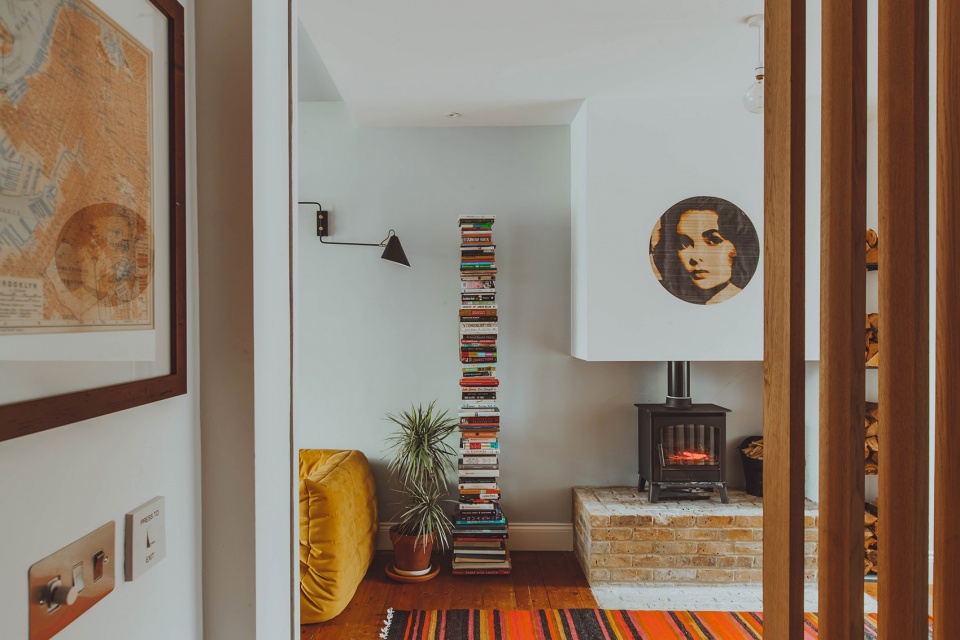 The fireplace was reinstated, on a brick plinth that blends in with the original timber floor. The glazed side-return extension allowed for far more light, and opened the floor plan, with a subtle level changing emphasizing the cosy existing living room, and the modern new dining and kitchen area.