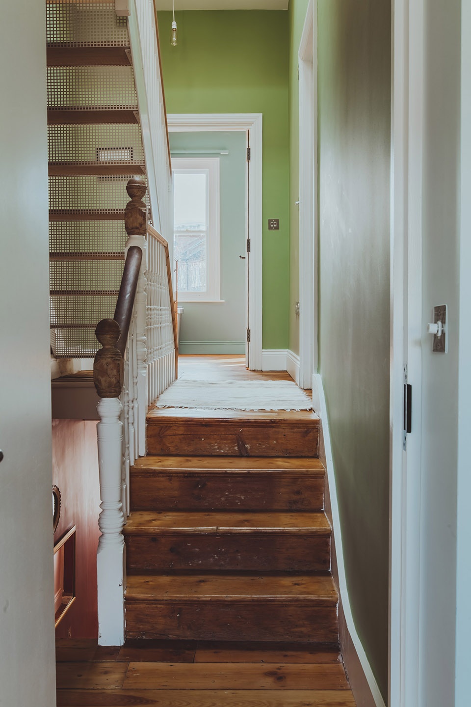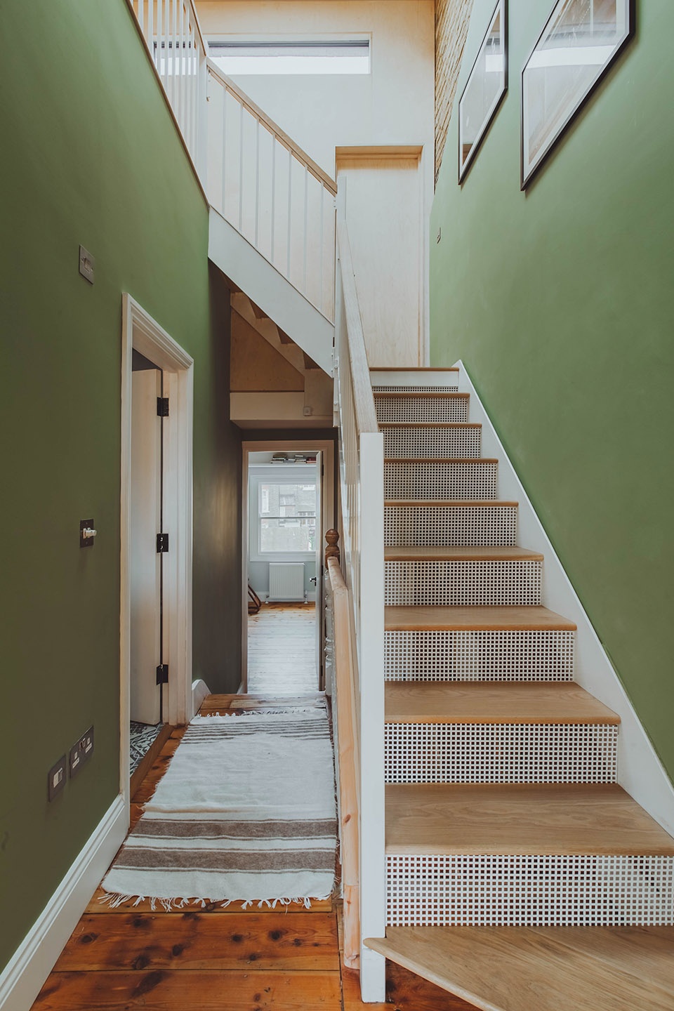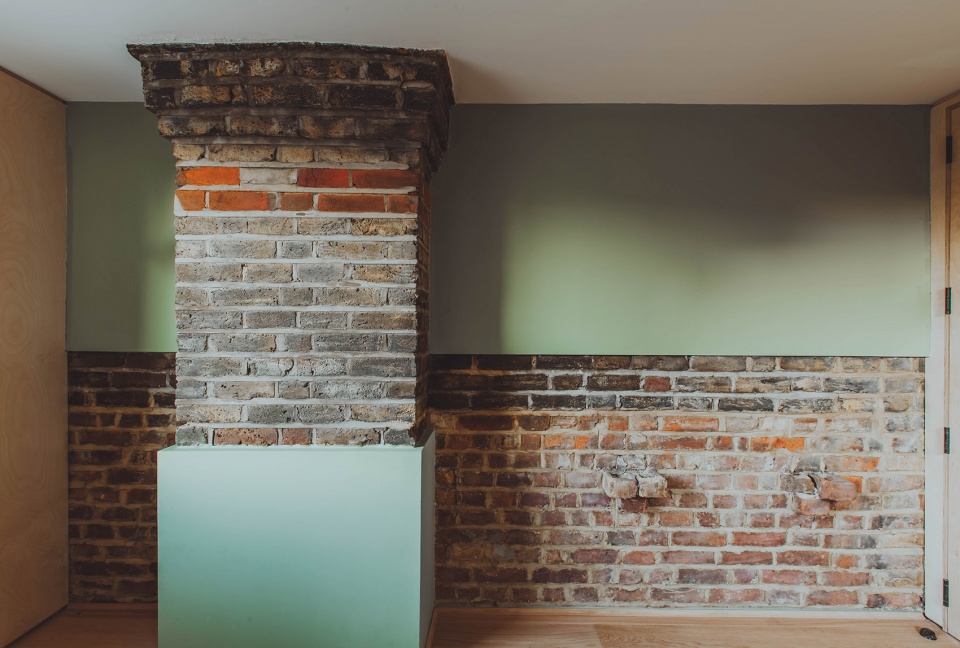 A generous double-height space in the loft with a skylight above floods the stairwell of the home in light. The warmth of the timber extension, contrasts to the emerging, colourful surfaces from the floors below, striking a line as a nod to the original roof pitch. “We took great care to maintain the history of the original terrace building, exposing original padstones, ridge lines and timber flooring where possible as re-imagined details,” said the studio directors.