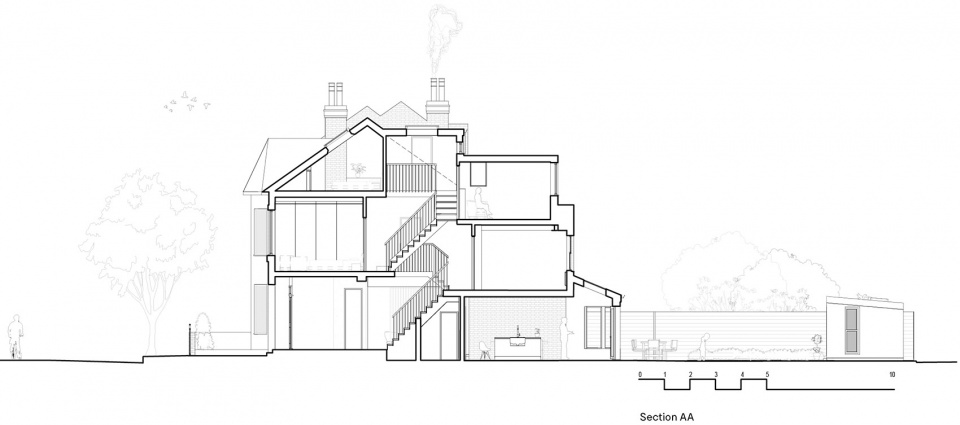 位于砖砌基座上的壁炉得到了修复,与既有的木地板融为一体。侧方以玻璃围合的扩建部分为房屋引入了大量的光线,使建筑平面得以展开,并通过细微的层级变化来突出舒适的客厅和新增的充满现代感的餐厅和厨房区域。