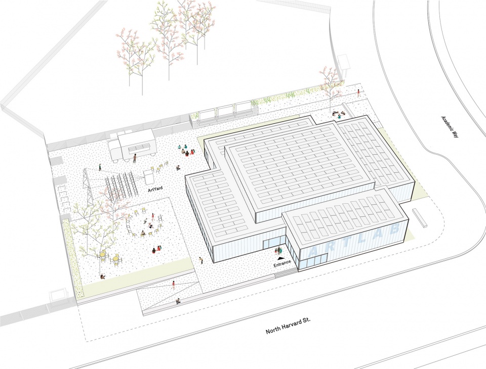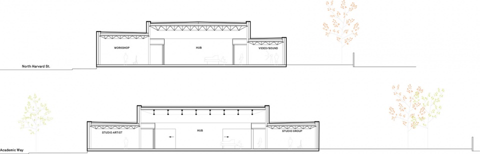 这座单层建筑拥有一个如风车般的平面:公共空间作为“枢纽”位于中央,其四周分布着一系列工作室、工作坊和媒体空间。中央空间可以通过四扇大型滑动隔断实现开启和关闭,以便为各类表演和展览提供场所,激发ArtLab的互动性。周围的空间包含了录音棚、声音剪辑站以及各类排练和非正式表演空间。ArtLab鼓励使用者积极参与跨学科的艺术实践和研究,以共同促进学校乃至Allston和剑桥地区的艺术活跃度。