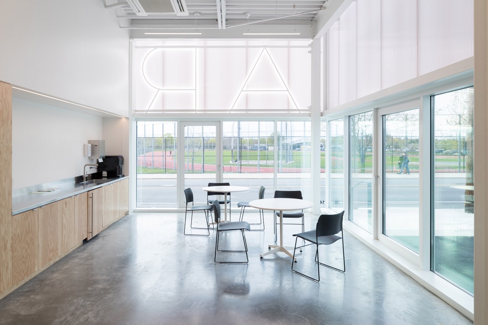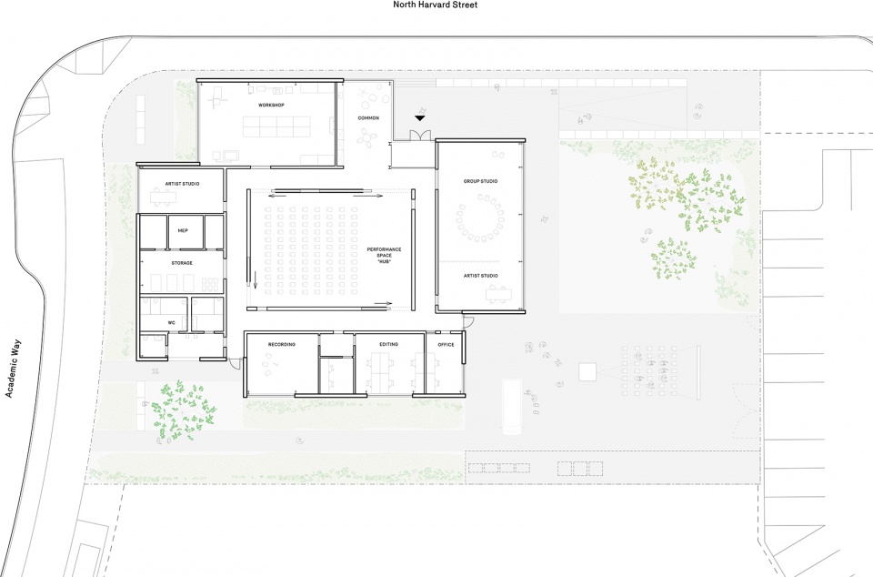The building, a one-story “pinwheel-like” plan, consists of a series of studios, workshops, and media spaces that surround a common “Hub” space. The Hub, which can be opened and closed by a series of four large sliding partitions, enables performances and exhibitions, cultivating interactivity at the ArtLab’s center. Surrounding spaces provide recording studios, sound-editing stations, and rooms for rehearsal, improvisation, and informal performance. The ArtLab encourages and expands participants’ engagement with interdisciplinary arts-practice research, serving as a collaborative activator for the school and the greater Allston and Cambridge neighborhoods.