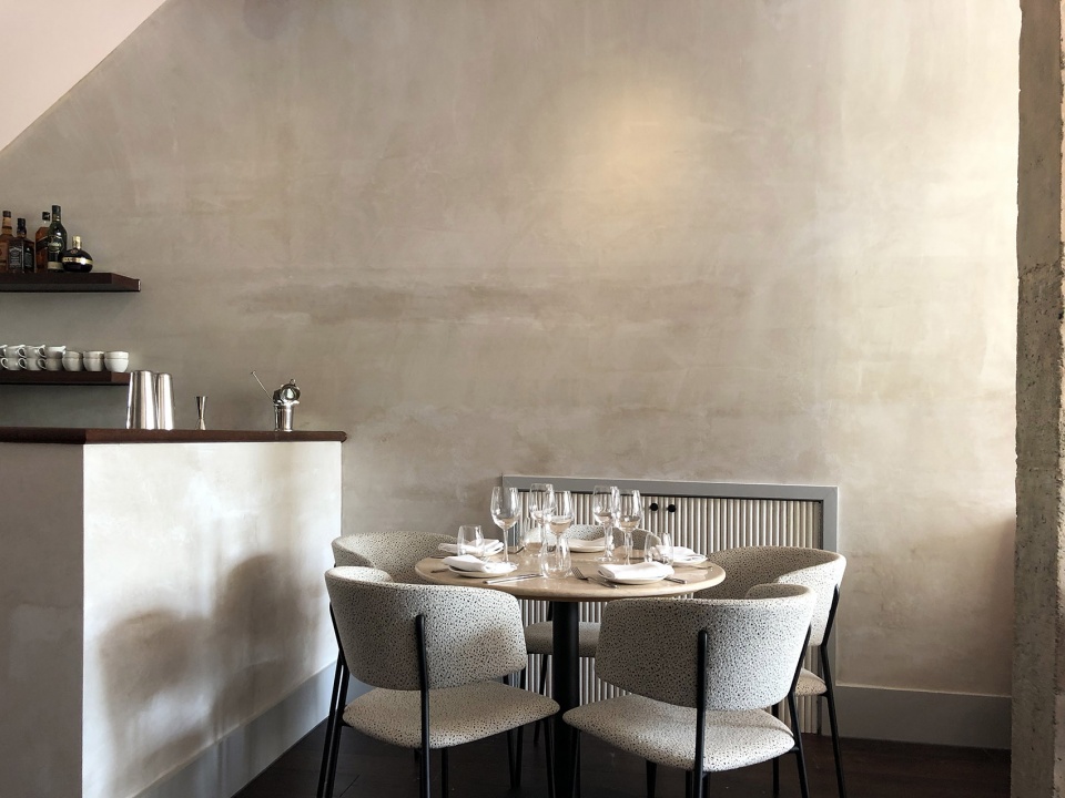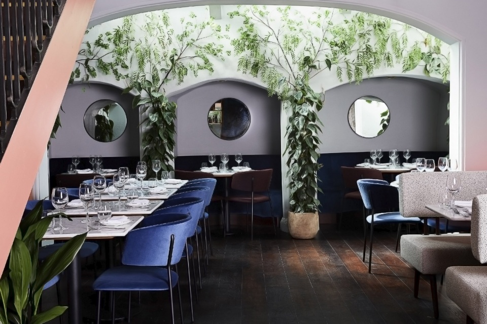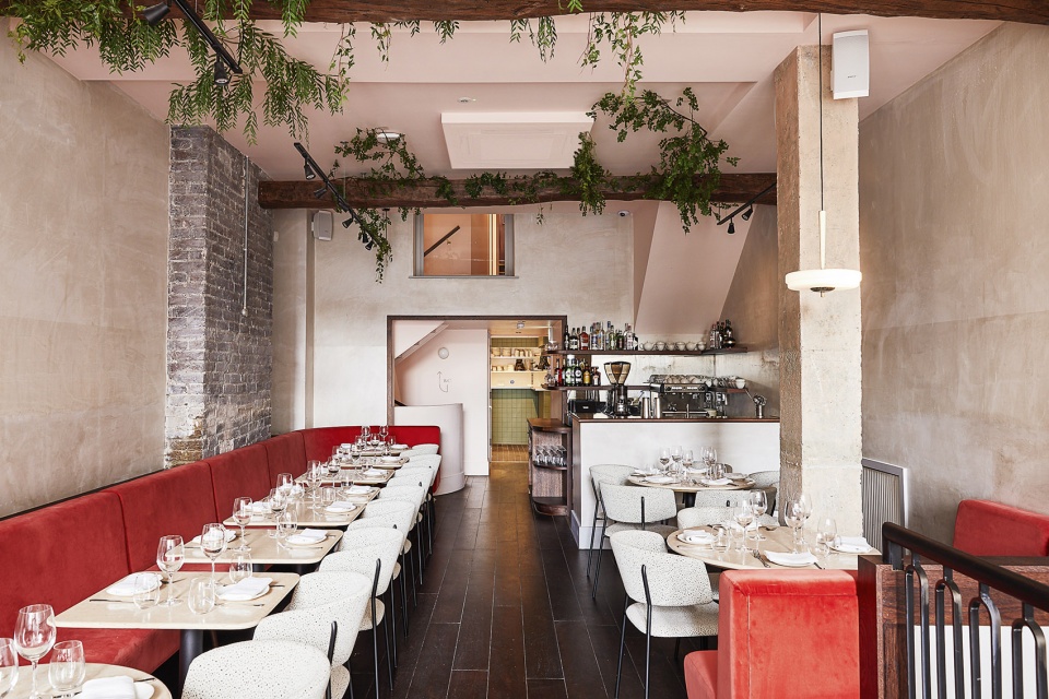 HAYA, designed by A-nrd studio, is split across two floors and feature floor-to-ceiling timber sash windows, flooding the restaurant with natural light from morning to evening. Featuring warm oak wood flooring, textured concrete walls and a plant-laden green ceiling, the ground floor of the restaurant is dedicated to the dining room, with blush marble topped tables dotting the space, and velvet and terrazzo effect fabric adding splashes of colour against the concrete textured walls.