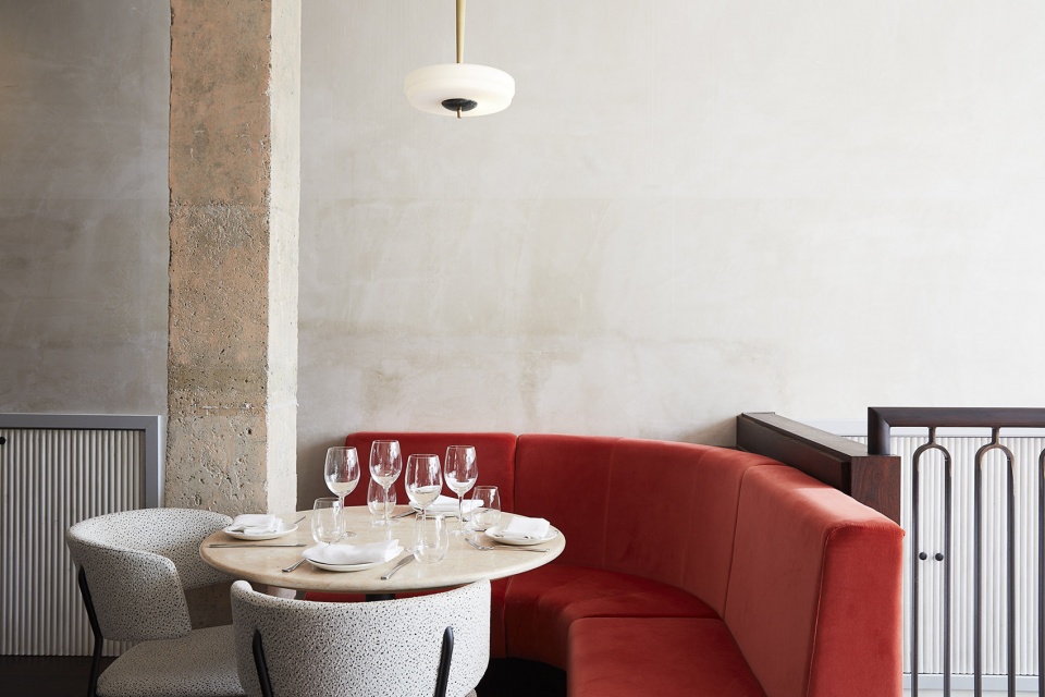 ▼餐厅局部,淡粉色的大理石餐桌、天鹅绒和水磨石座椅为混凝土质感的空间增加了色彩点缀,partial interior view of the restaurant, the blush marble topped tables dotting the space, and velvet and terrazzo effect fabric add splashes of colour against the concrete textured walls