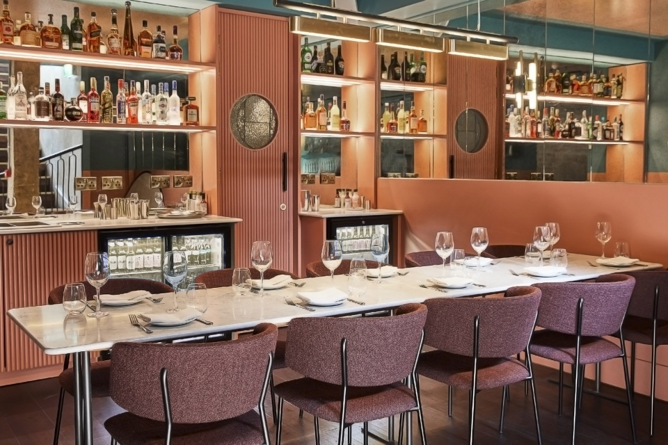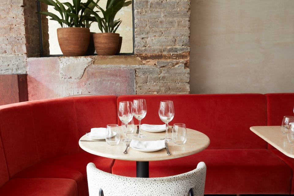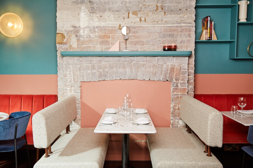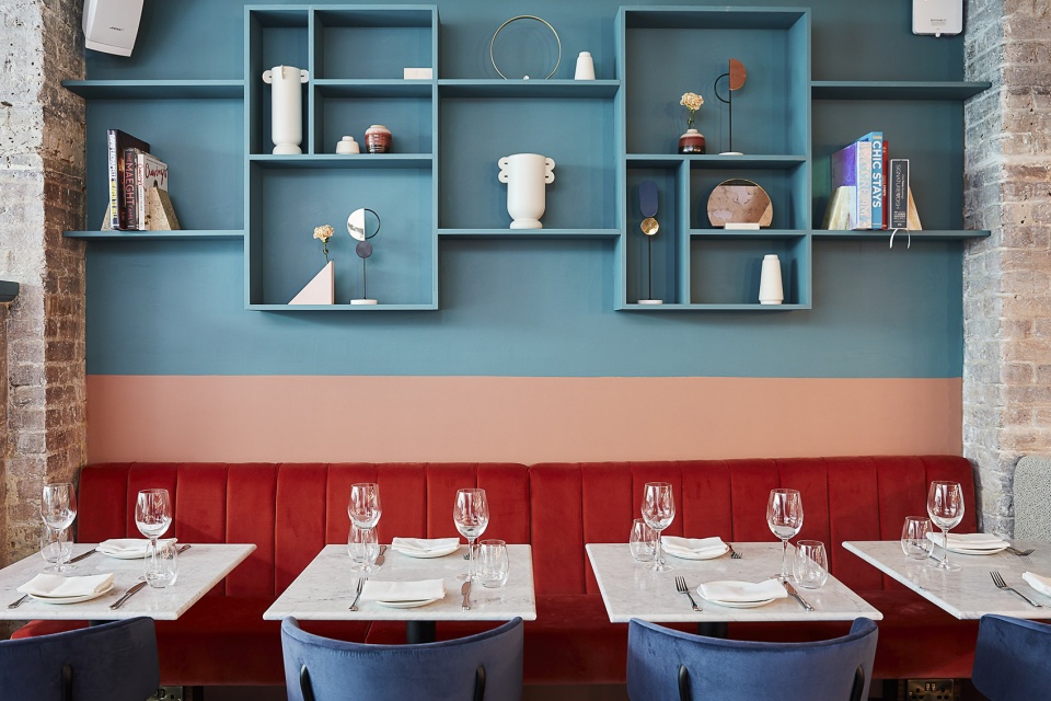 At the far side, the kitchen is open, allowing guests to see and hear the action unfold. Downstairs takes on the warmth of a Tel Aviv household, from the home-style bar featuring a bespoke stained glass window to the large white marble sharing table and the bold coloured walls lined with mirrors and art work.