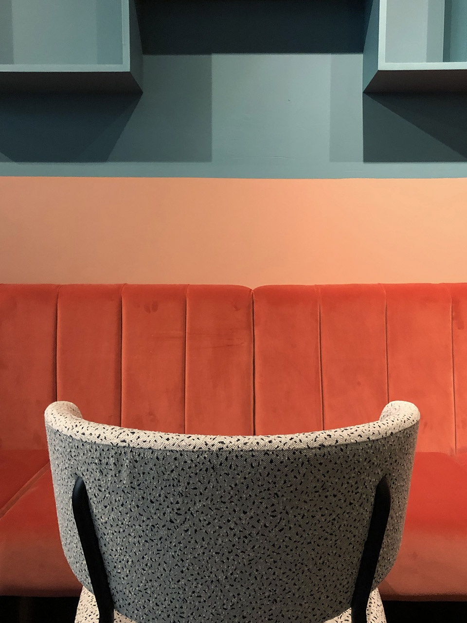 ▼餐厅局部,水磨石座椅、大理石桌面、彩色的墙体和砖墙结构相得益彰,partial interior view of the restaurant, terrazzo seatings, marble tables, colored walls and brick structure complement each other
