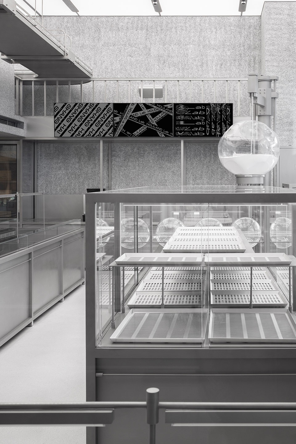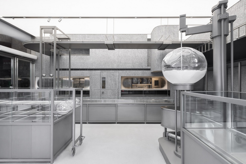 We envisioned the space as a “systematic” manufacturing factory, where the products displayed here are more like industrial objects that were made with precision and control. The mechanical components imply the advancement of standardization and automatic technologies. The high-conveyor belt and the every-circulating flour container, curated in an artistic way, can be adapted as scenes for display, bringing people into an “experimental lab” to experience the complexity of mechanized world and to be spiritually connected with the brand in multiple ways.