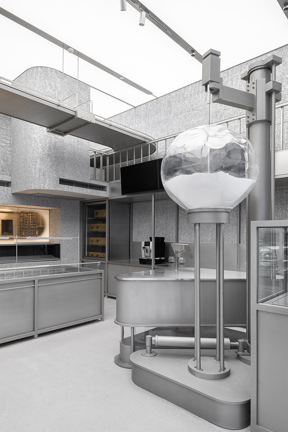 我们将场景想象成一个“系统化”的生产车间,在这里陈列的产品更像是精确、可控的工业制品。机械组件暗示着标准化与自动化技术的进步,通过艺术的表达将挑高的传送带以及循环搅动的面粉容器作为可陈列、展示的场景单元,让人们仿佛置身于一个“实验场”,感受机械化时代背景下的复杂性。同时,也为品牌与大众建立了一个立体的多维度的情感共鸣场所。