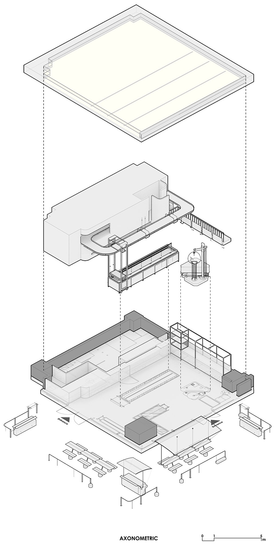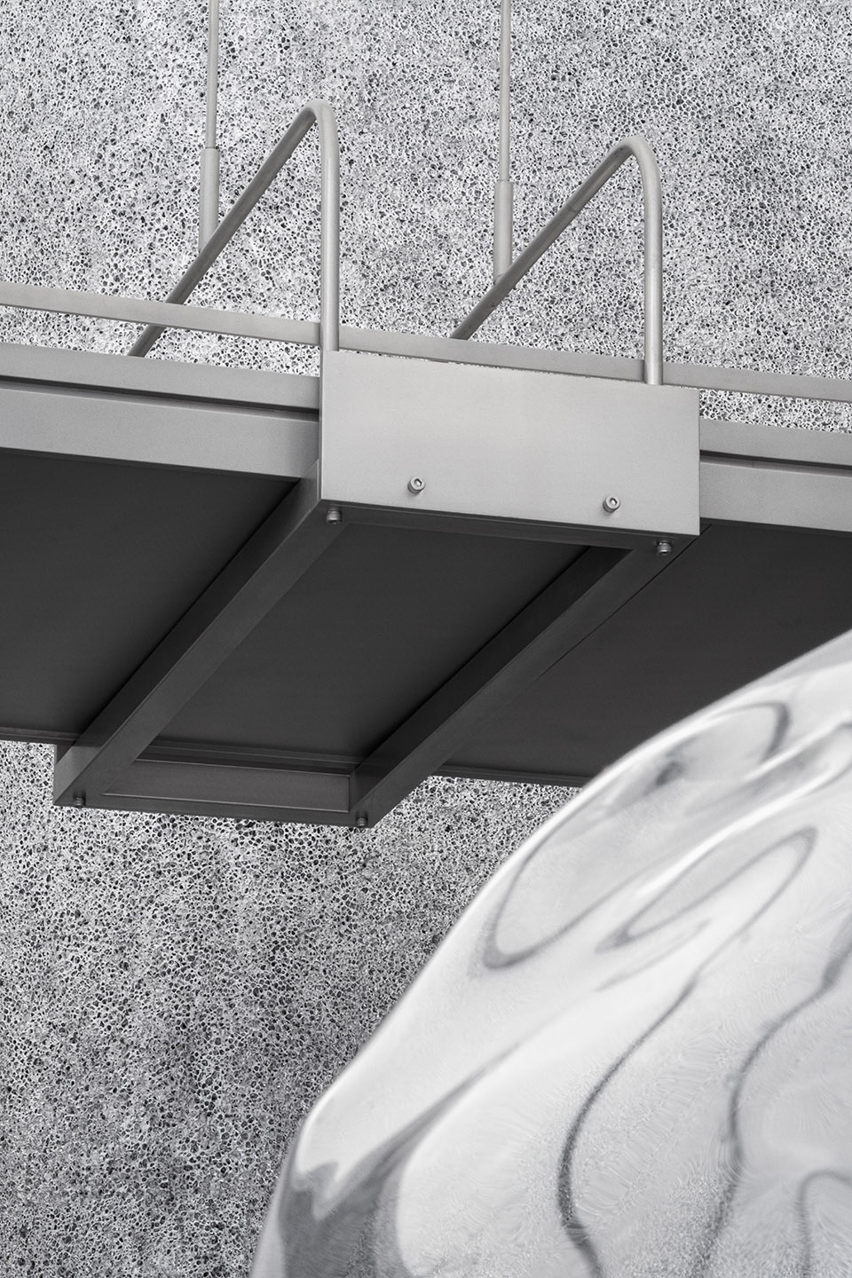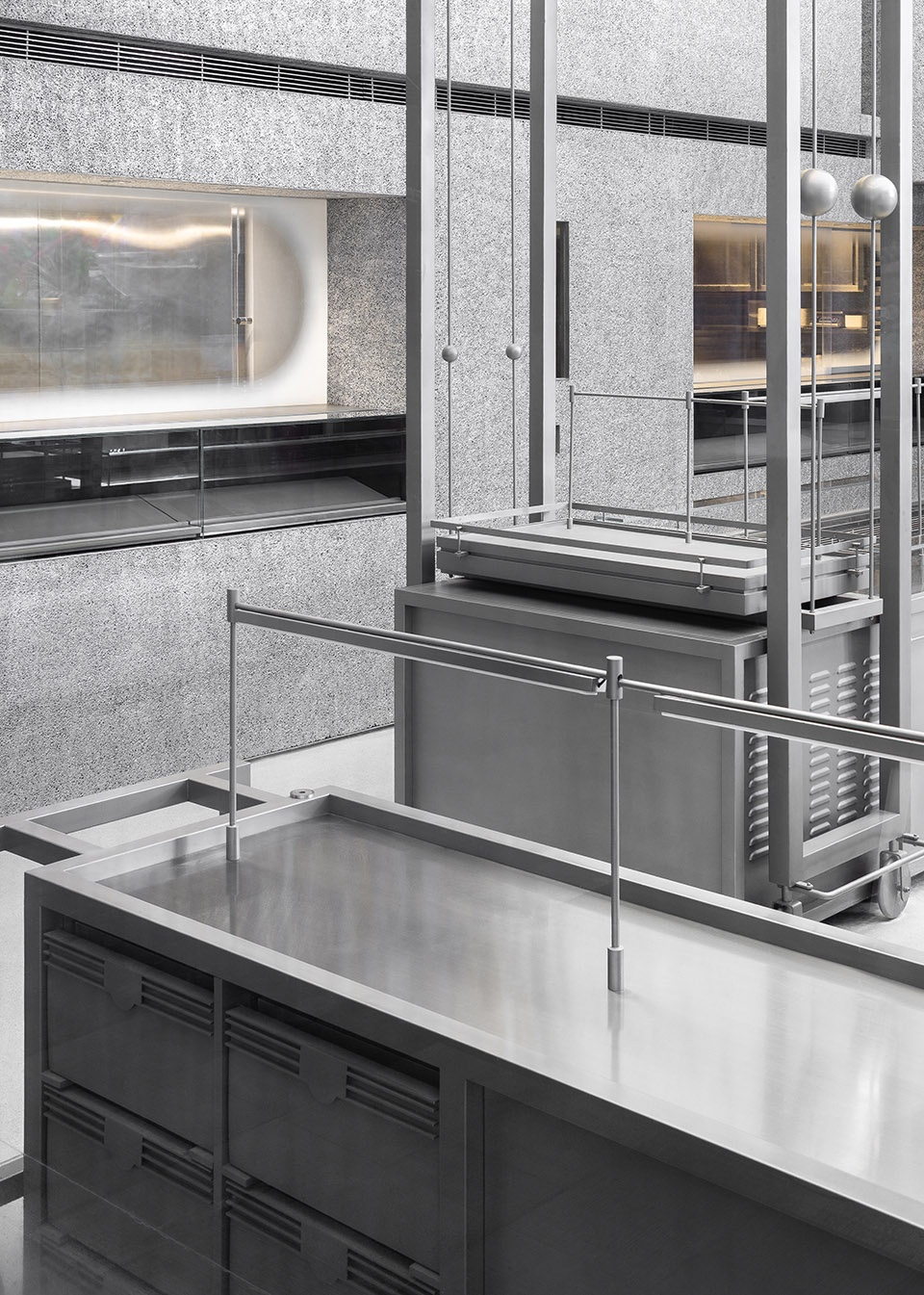 Different materials are stitched, overlapped and extended to offer the most direct way to read the space. Materials in grey tone, for example the foamed aluminum and stainless steel, are glowing with pure quality under the light film. The designer selected materials in low saturation to make sure the mechanical devices stand out as the leading character in the space.